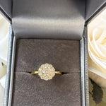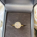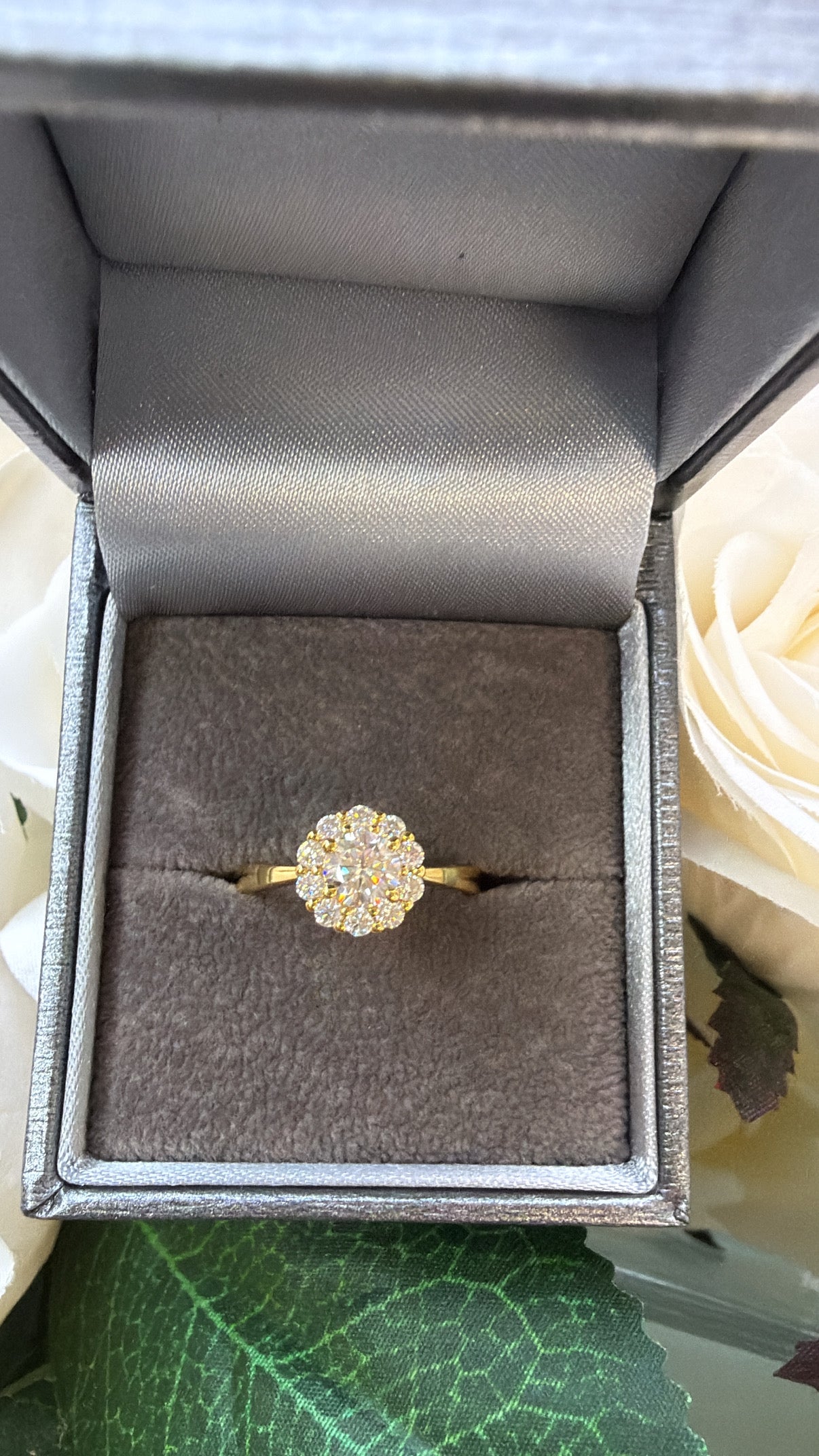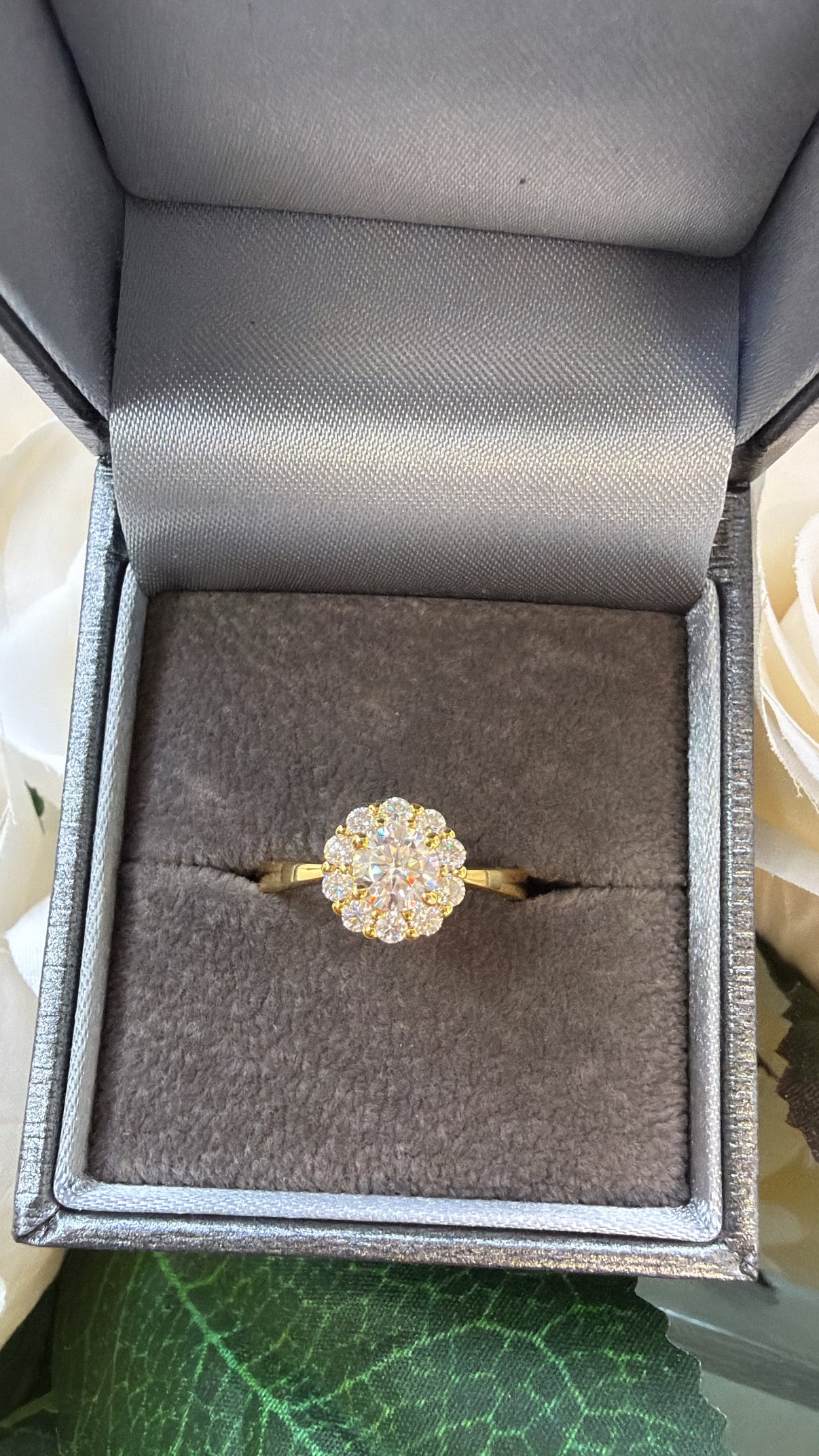 At the centre sits a brilliant round-cut moissanite, framed by a delicate halo of shimmering accent stones that enhance its fire and brilliance. Set on a slim, polished band, this ring offers an elegant balance of classic glamour and everyday wearability.