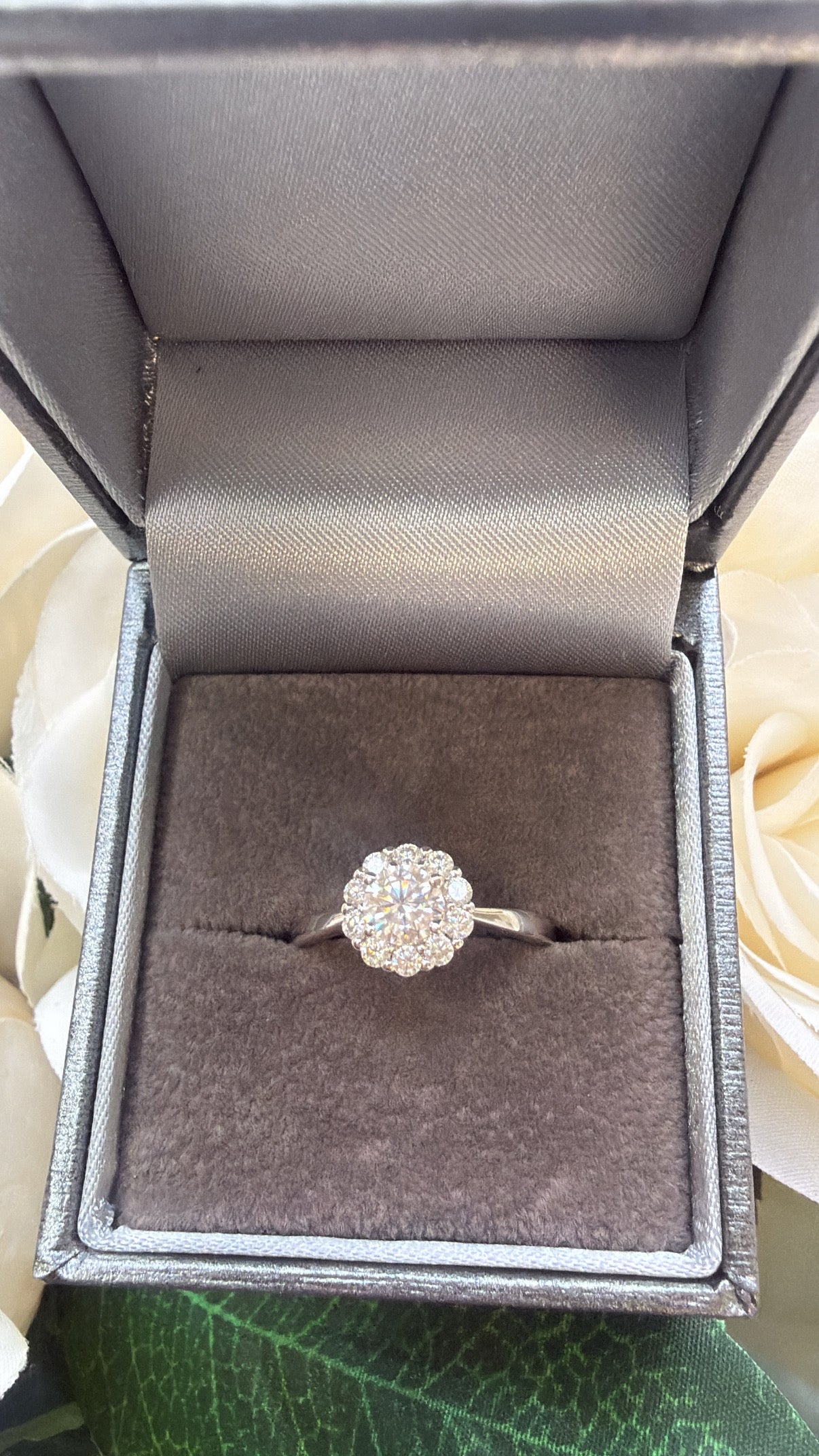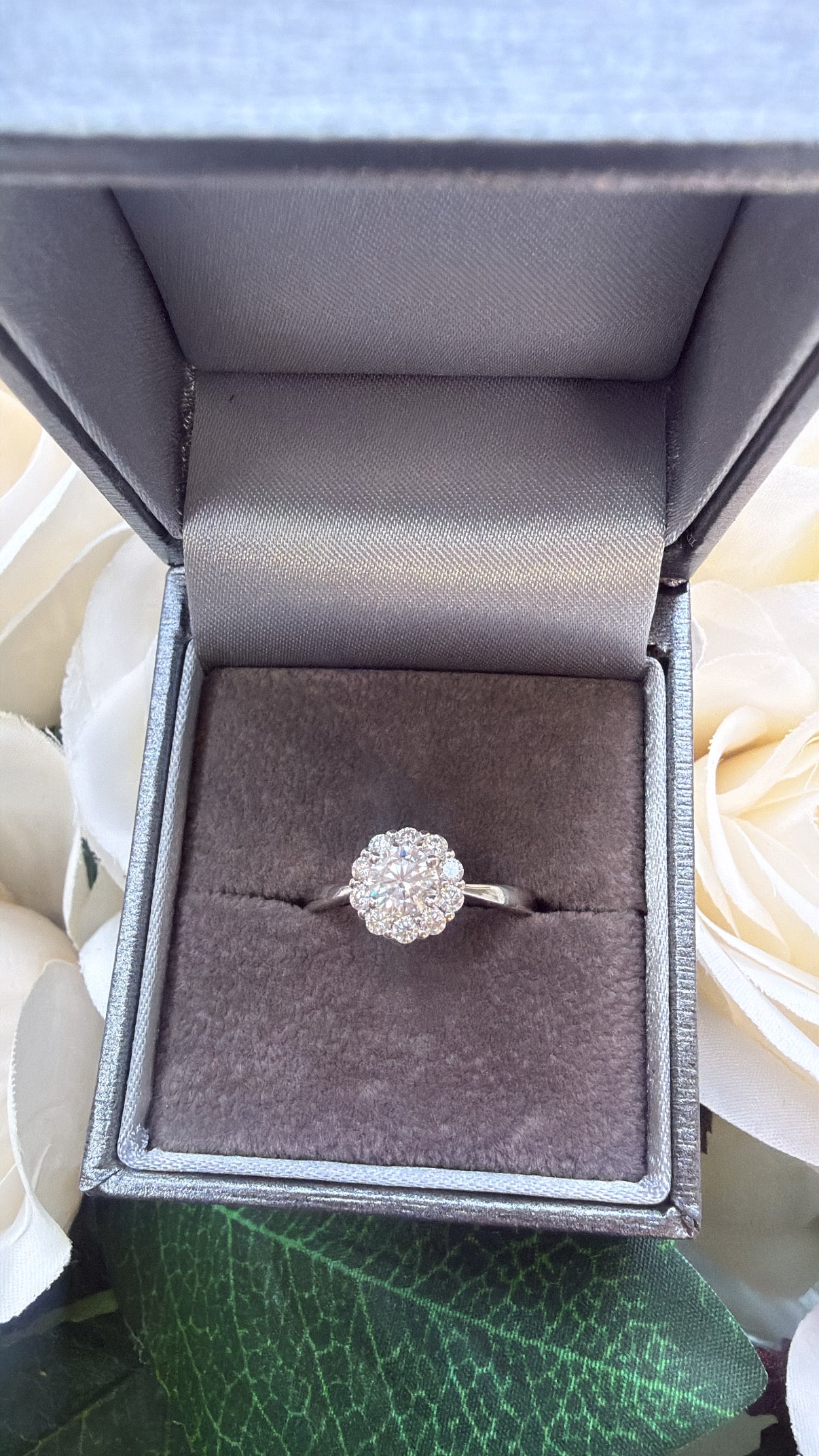 You can download any free ring sizer app if you have a ring that fits or you can measure the circumference of your finger with a piece of thread and convert using our ring size conversion chart here .