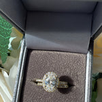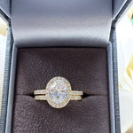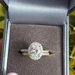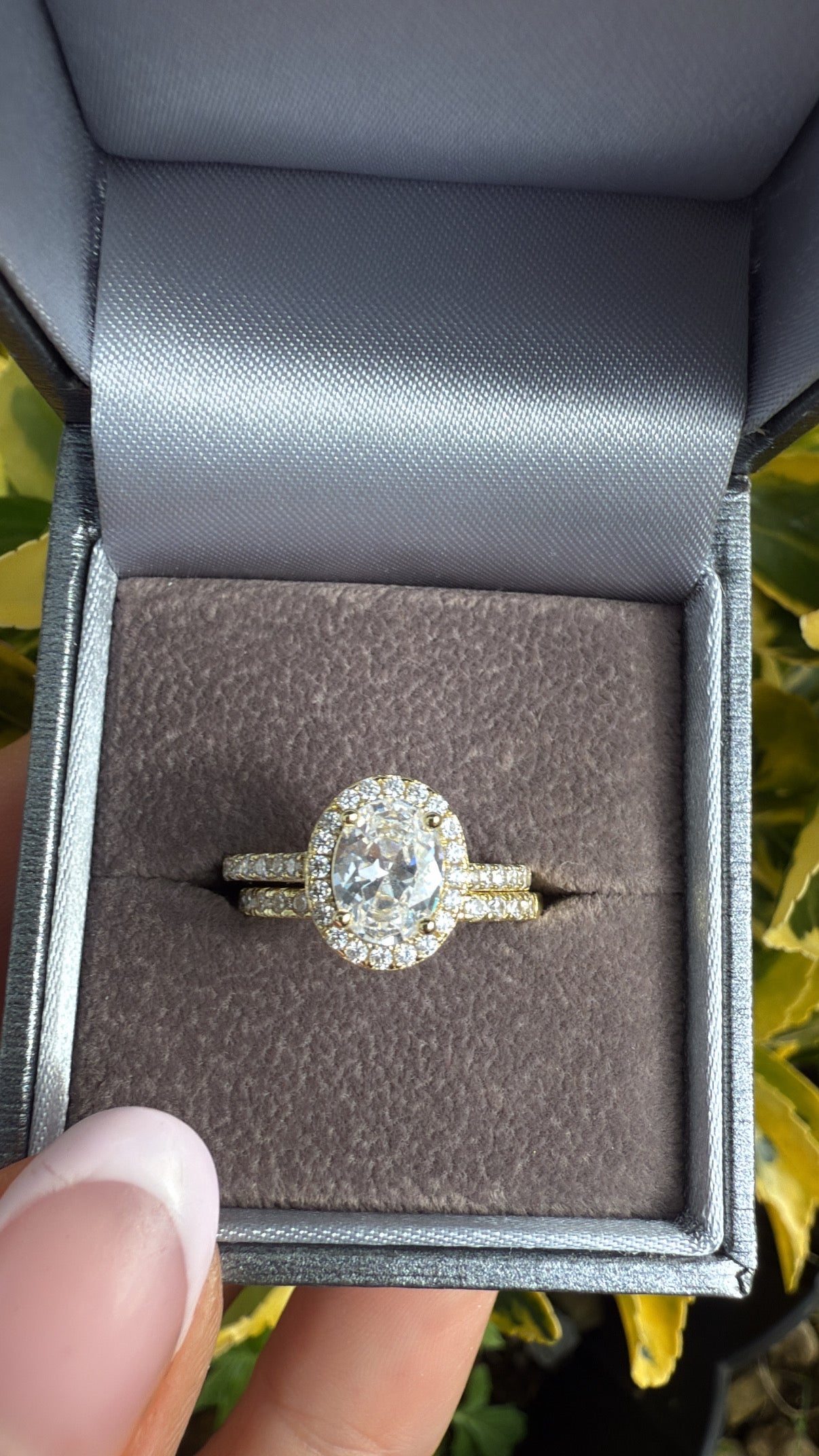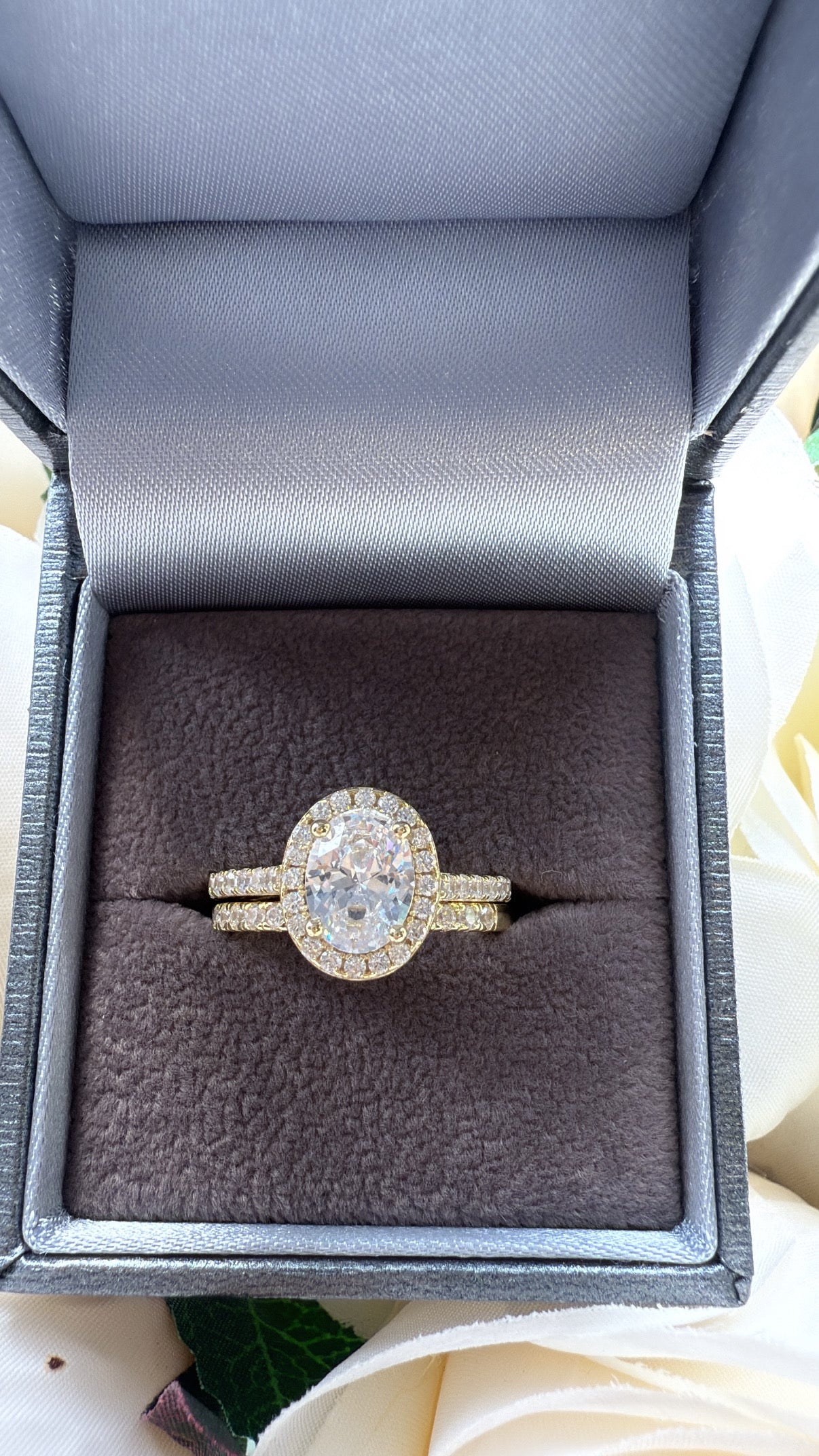 Make a statement with this breathtaking oval-cut halo ring set, beautifully crafted in gold-plated 925 sterling silver. The center stage belongs to a brilliant oval cubic zirconia, expertly framed by a halo of sparkling pavé-set stones, creating an elegant, timeless silhouette. The matching band features a full row of CZ stones, designed to enhance the overall sparkle and create a seamless, luxurious stack.