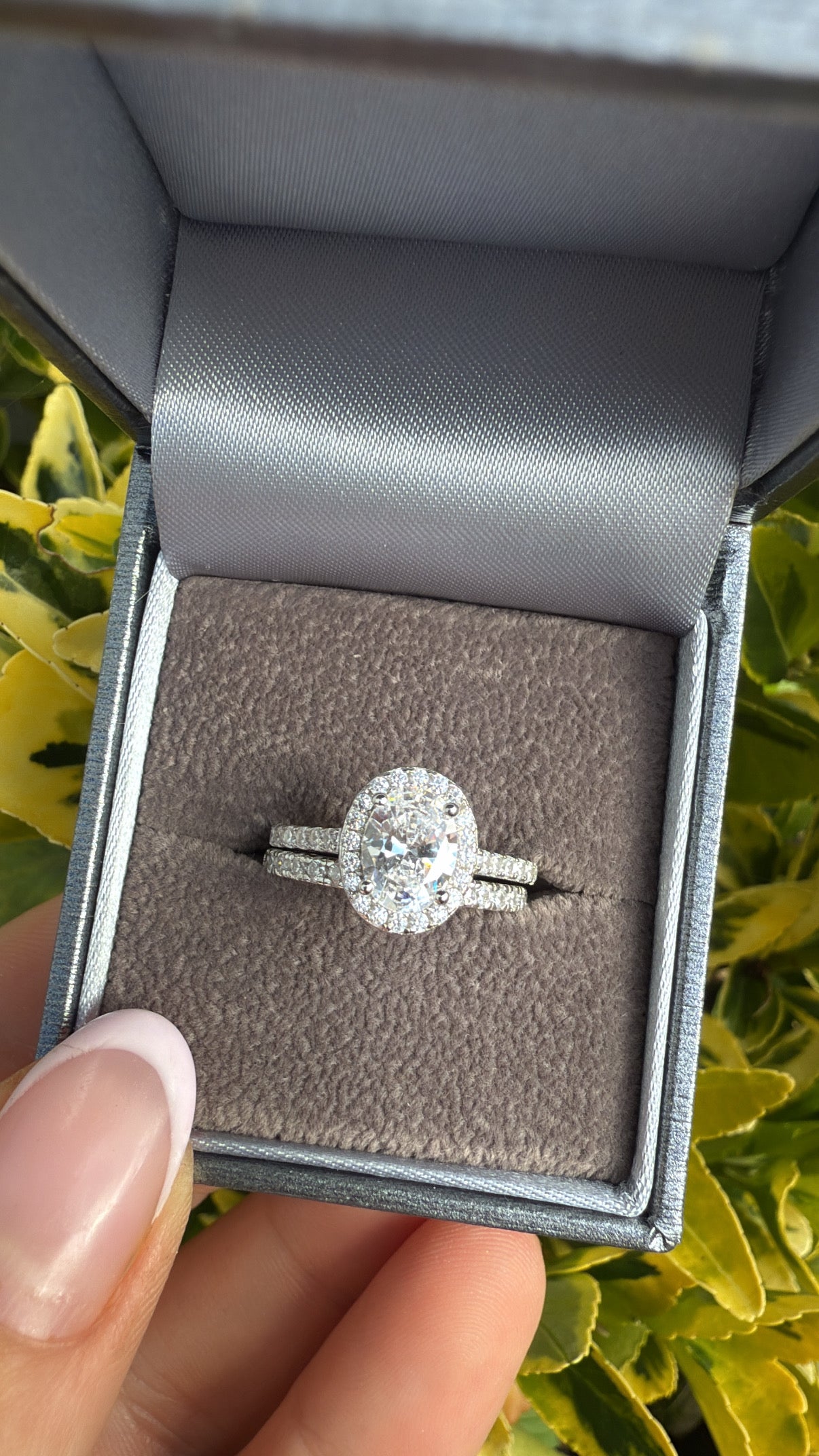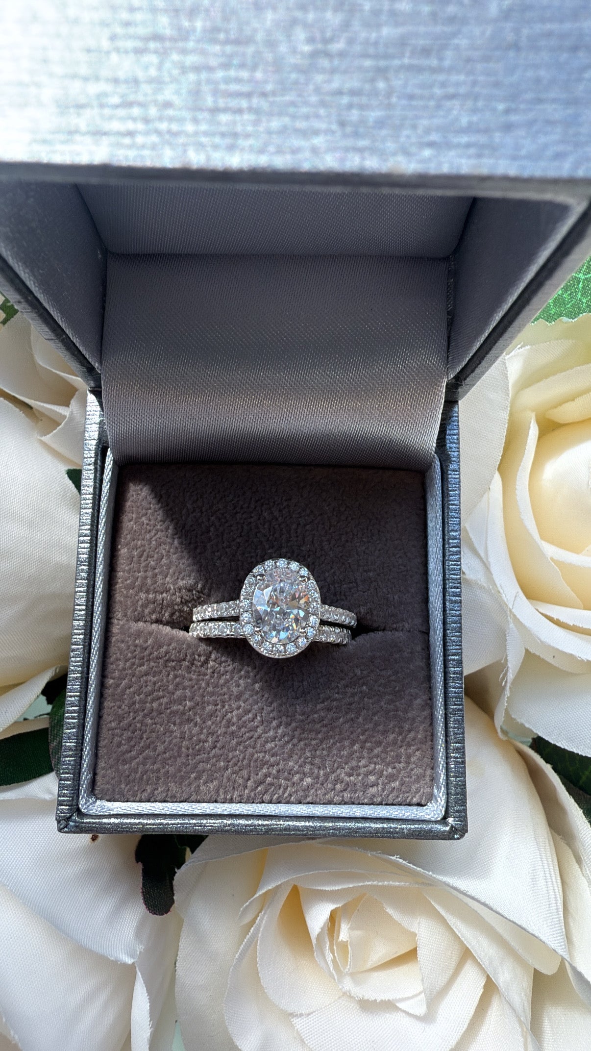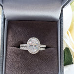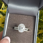 Make a statement with this breathtaking oval-cut halo ring set, beautifully crafted in 925 sterling silver and plated. The center stage belongs to a brilliant oval cubic zirconia, expertly framed by a halo of sparkling pavé-set stones, creating an elegant, timeless silhouette. The matching band features a full row of CZ stones, designed to enhance the overall sparkle and create a seamless, luxurious stack.