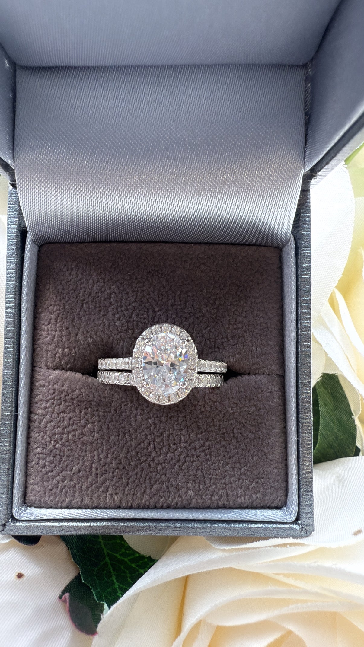 • Stunning oval-cut cubic zirconia centerpiece with halo setting