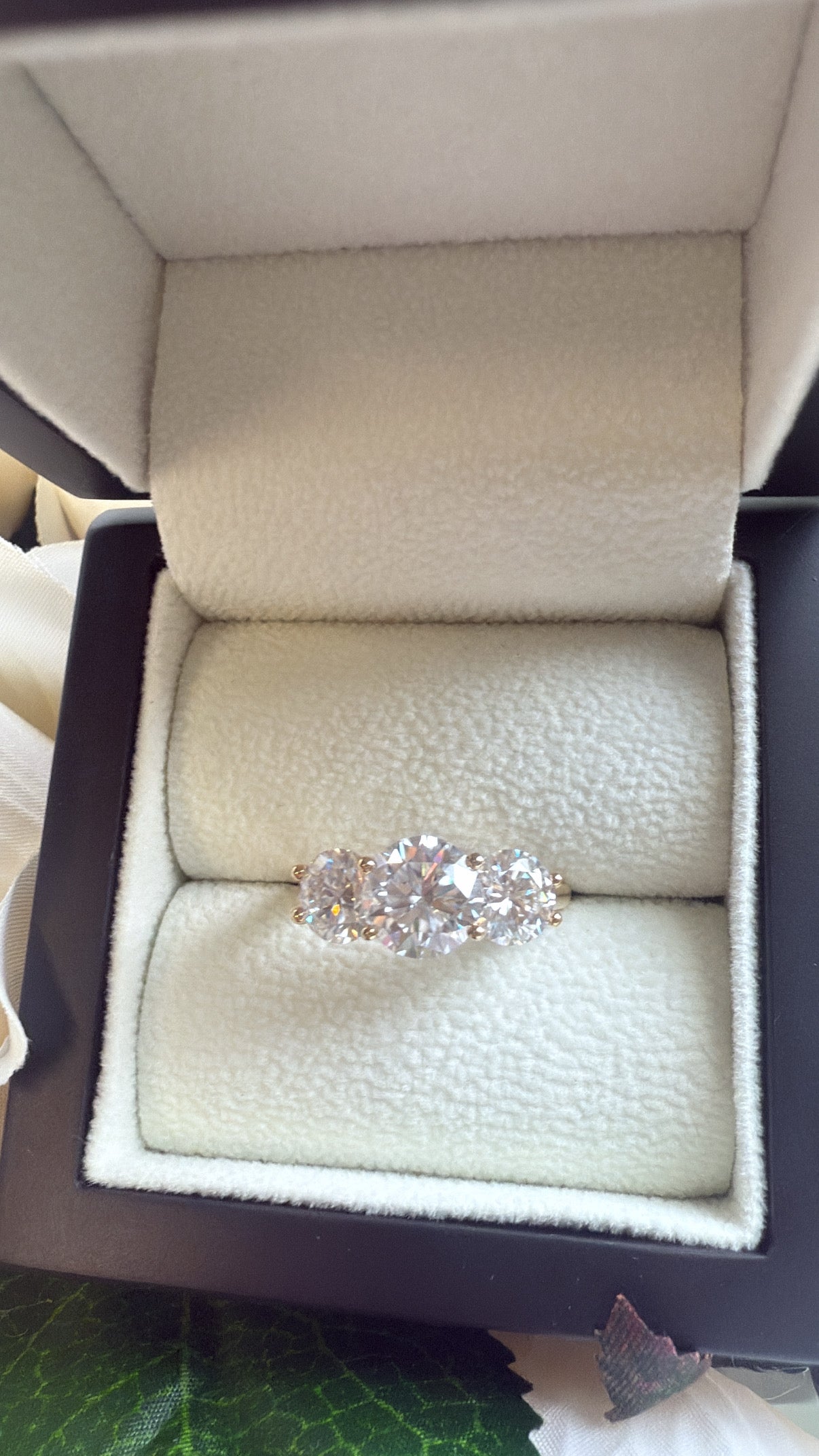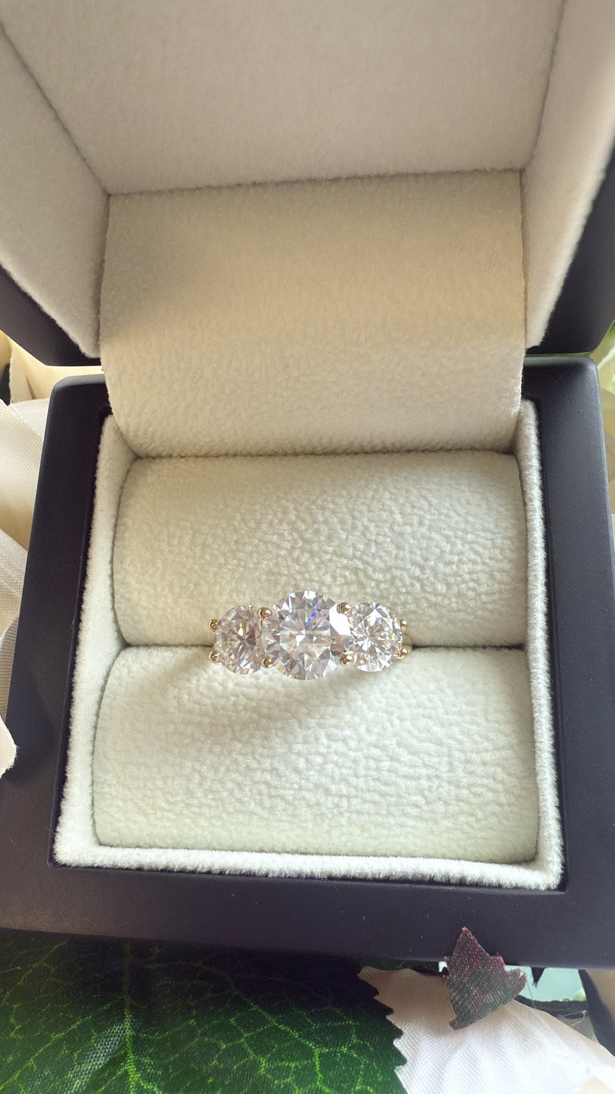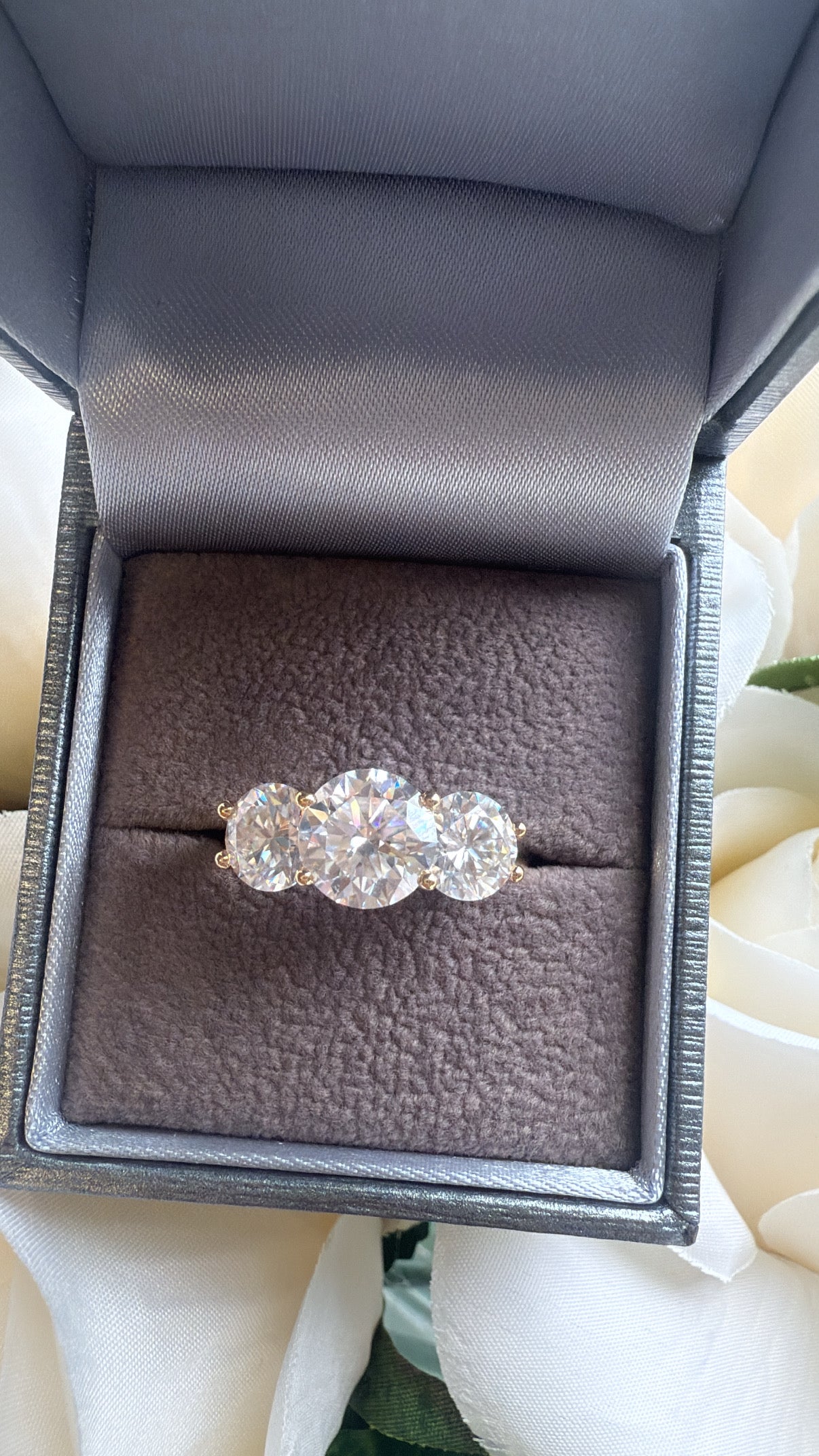 Celebrate everlasting elegance with this stunning 9ct gold three-stone moissanite ring, designed to capture light and attention from every angle. Featuring three round brilliant-cut moissanite stones, this piece symbolizes the past, present, and future — making it a meaningful and radiant choice for engagements, anniversaries, or simply to indulge in timeless luxury.