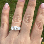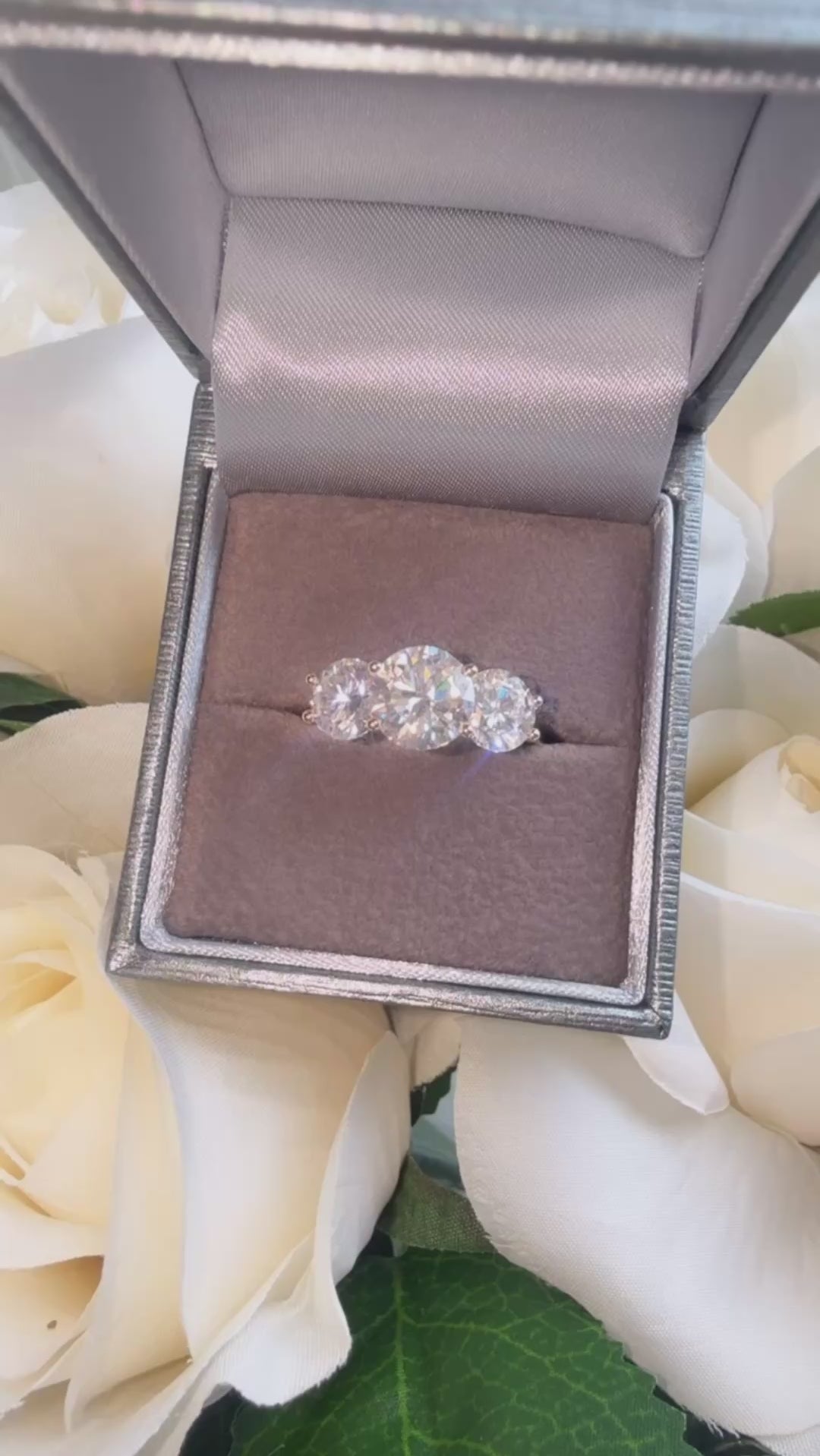 With unmatched sparkle and meaningful design, this three-stone moissanite ring is the ultimate expression of enduring love and style.