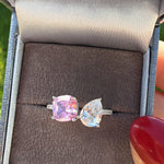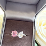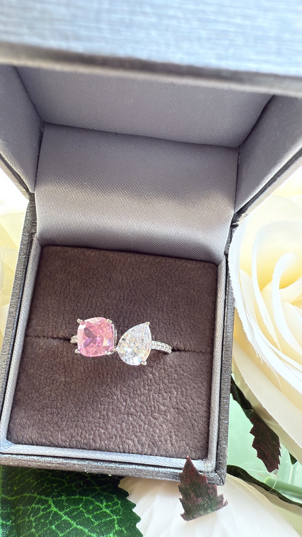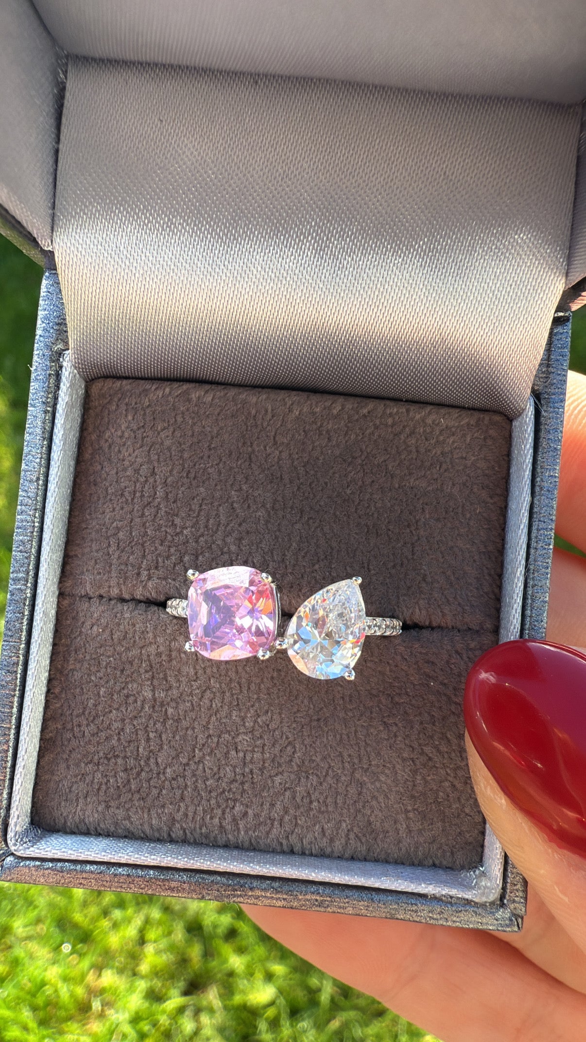 Delicately bold and beautifully feminine, The Adore Ring is designed to turn heads. Featuring a vibrant cushion-cut pink stone alongside a sparkling pear-shaped white stone, this open-top design symbolizes balance, duality, and modern romance.