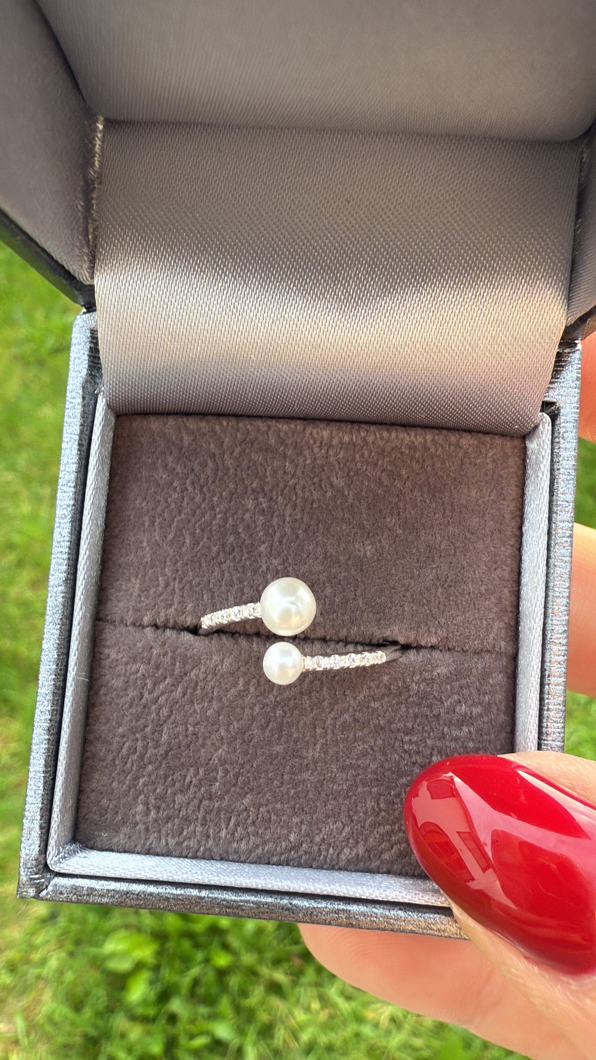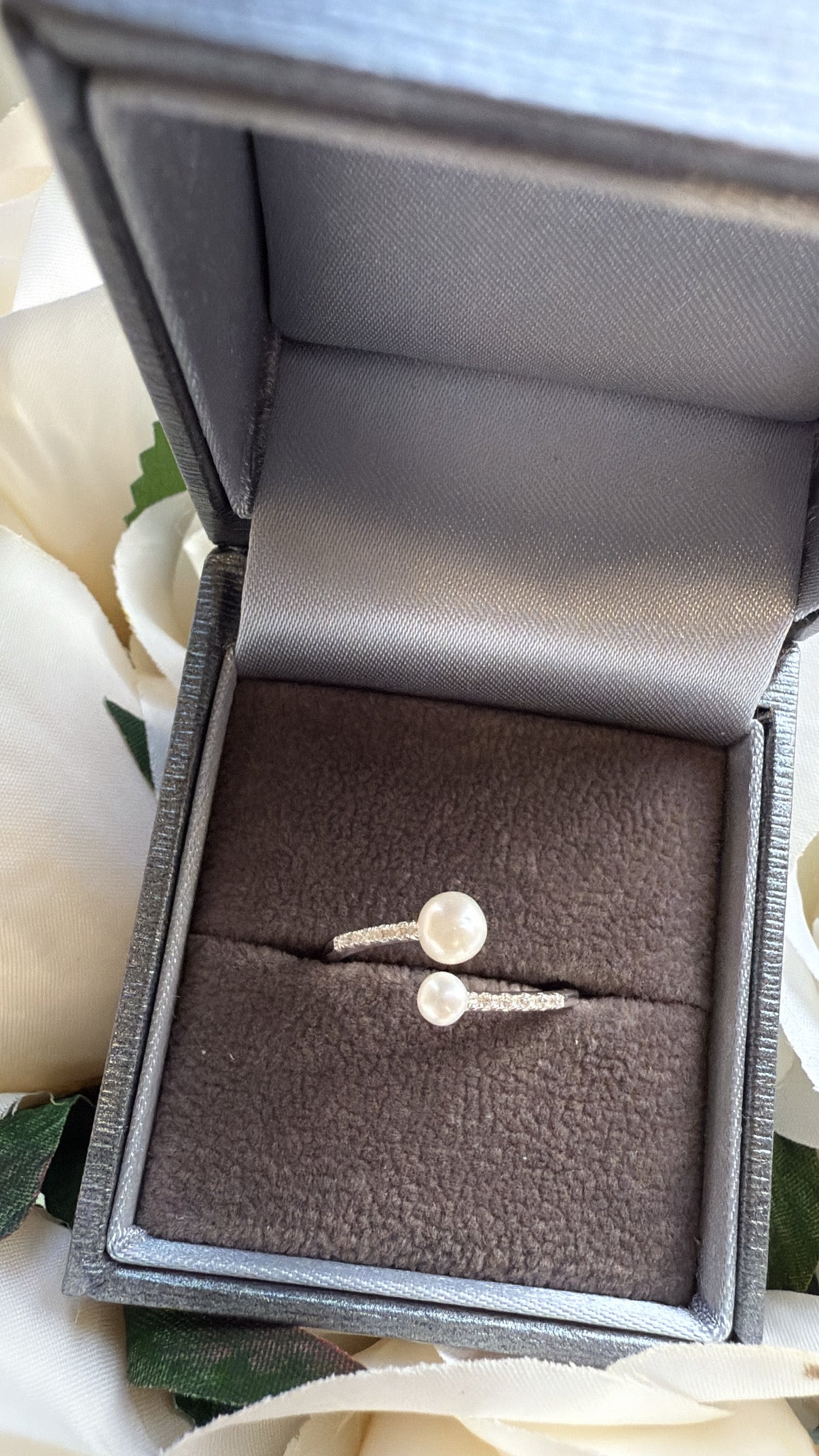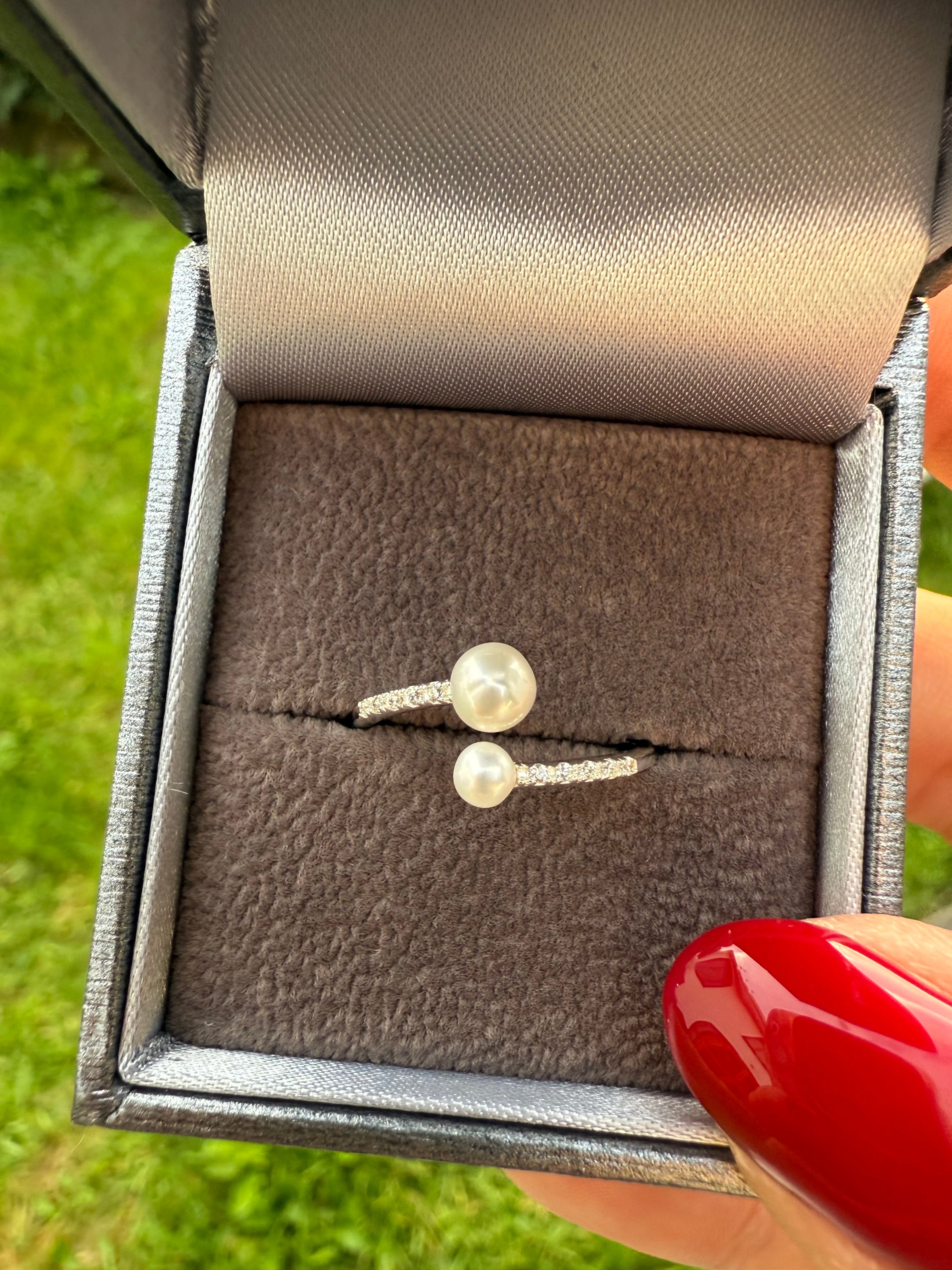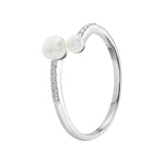 Graceful and refined, this ring features two luminous pearls in a modern open design — symbolising balance, love, and connection. The 925 sterling silver band is accented with sparkling cubic zirconia stones, adding just the right touch of brilliance to complement the softness of the pearls.