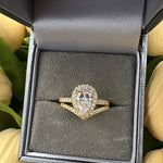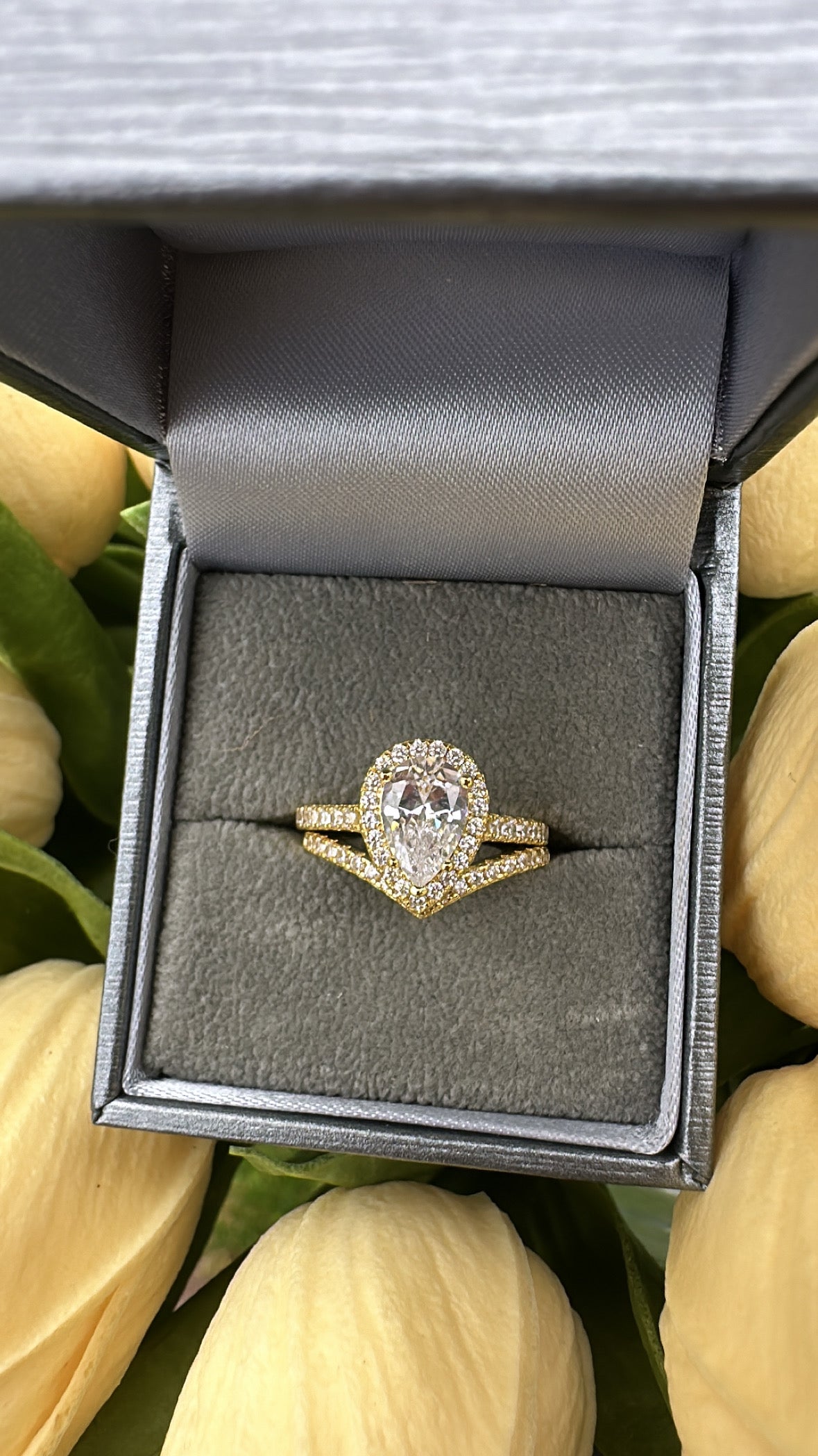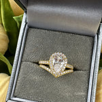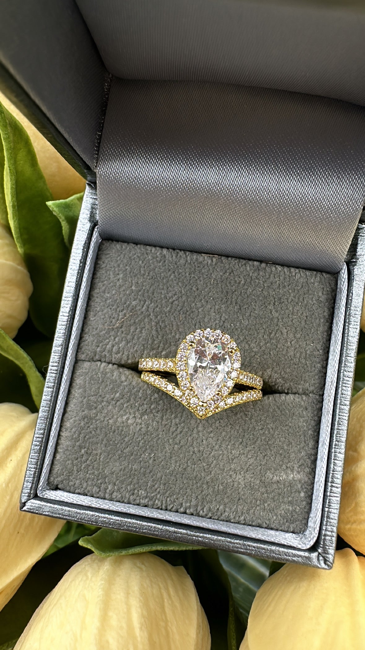•  Sterling Silver gold plated pear shaped ring with white zirconias decorating the outside setting in a delicate antique style arrangement.