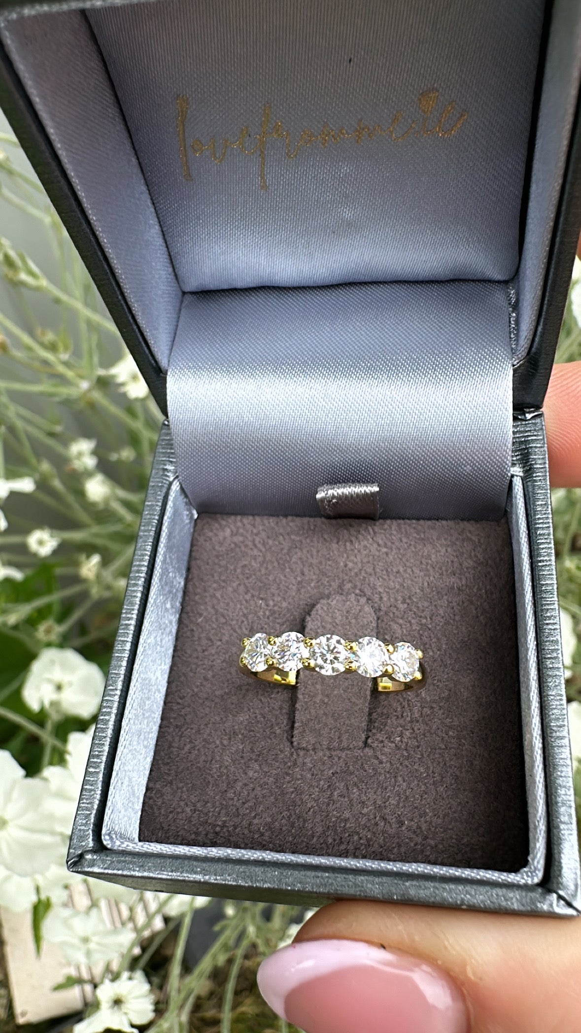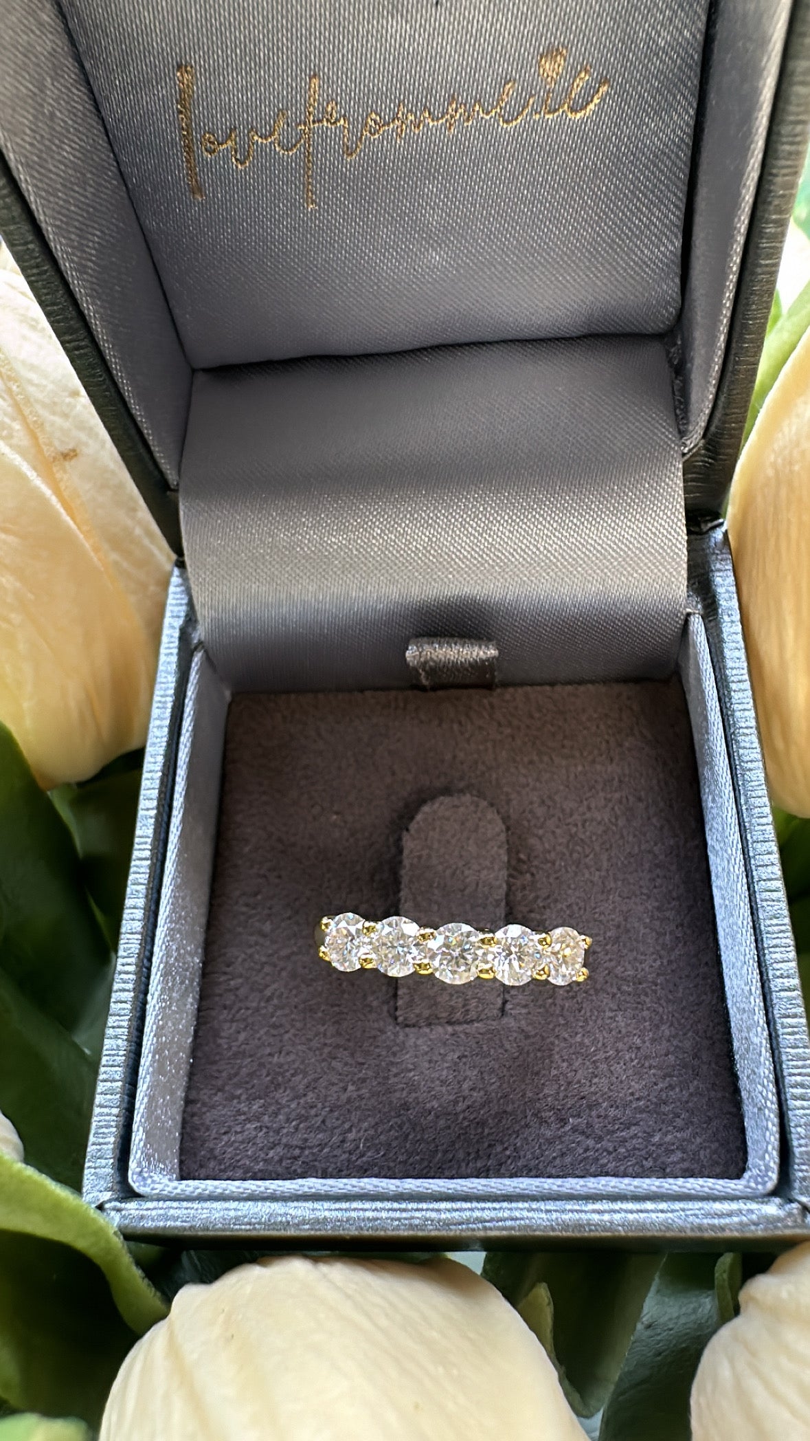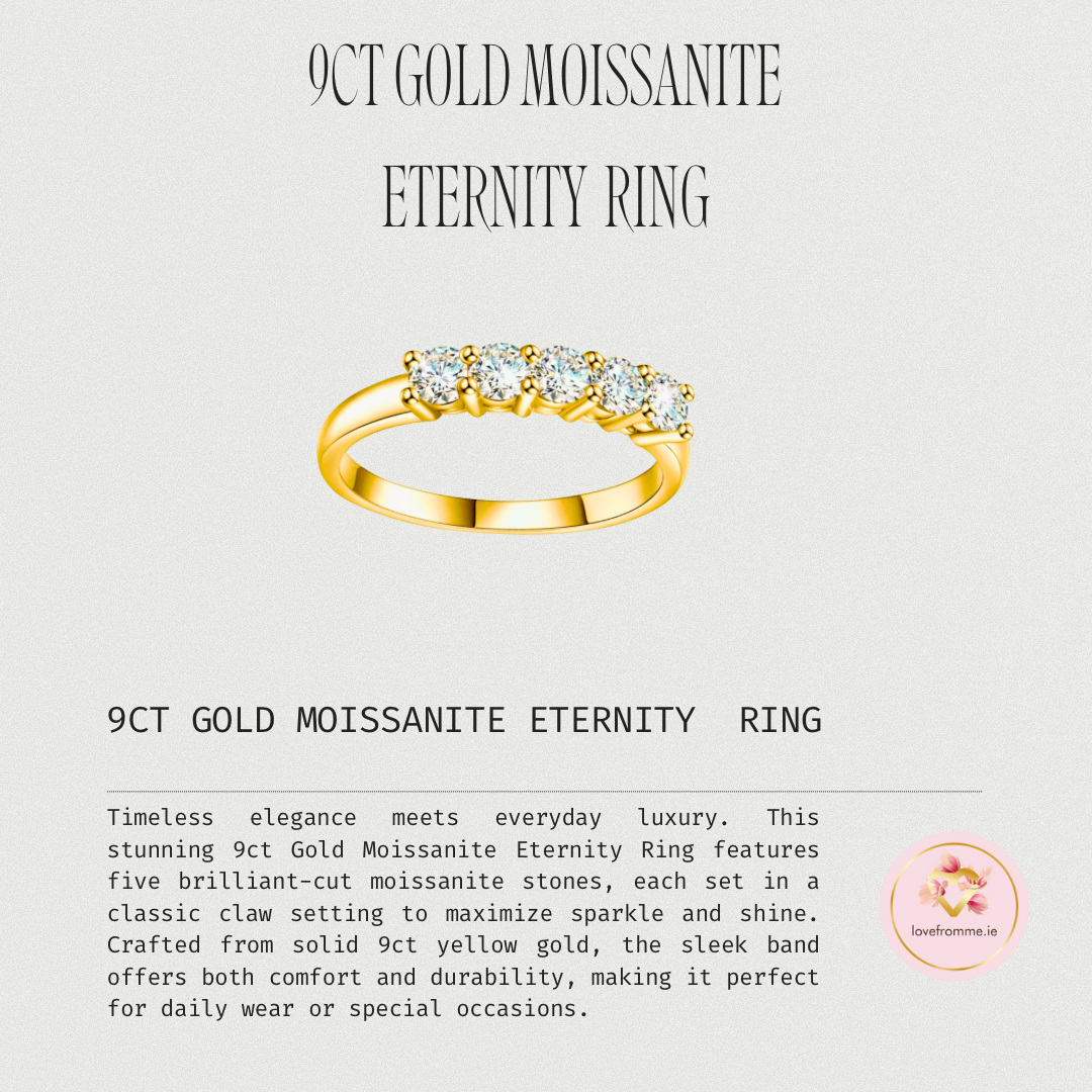 Timeless elegance meets everyday luxury. This stunning 9ct Gold Moissanite Eternity Ring features five brilliant-cut moissanite stones, each set in a classic claw setting to maximize sparkle and shine. Crafted from solid 9ct yellow gold, the sleek band offers both comfort and durability, making it perfect for daily wear or special occasions.