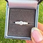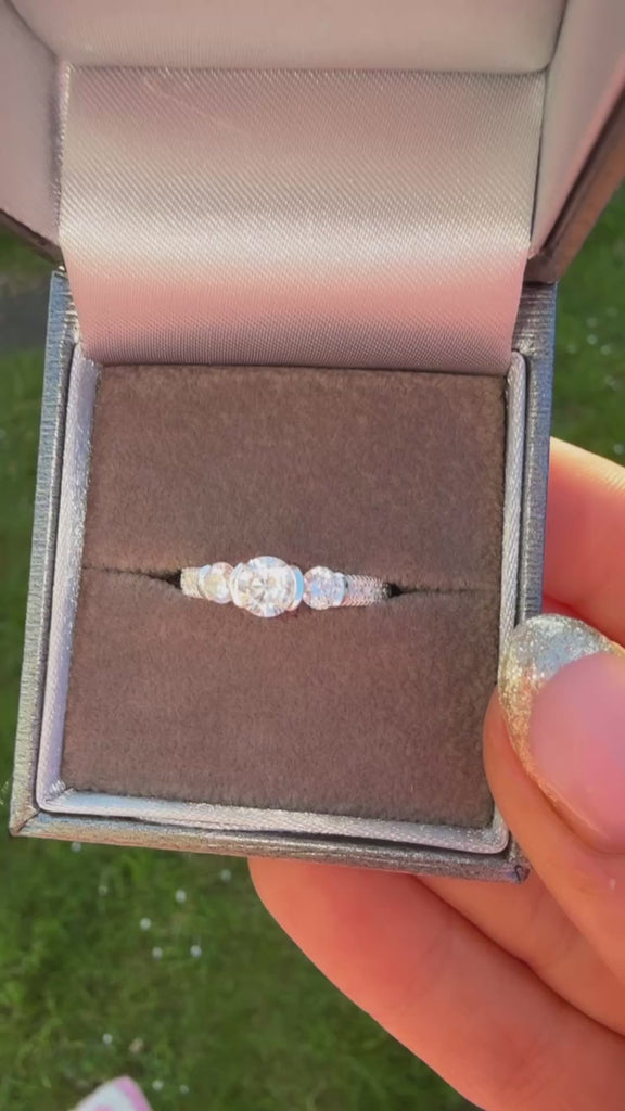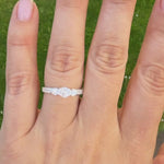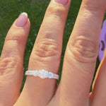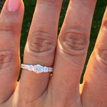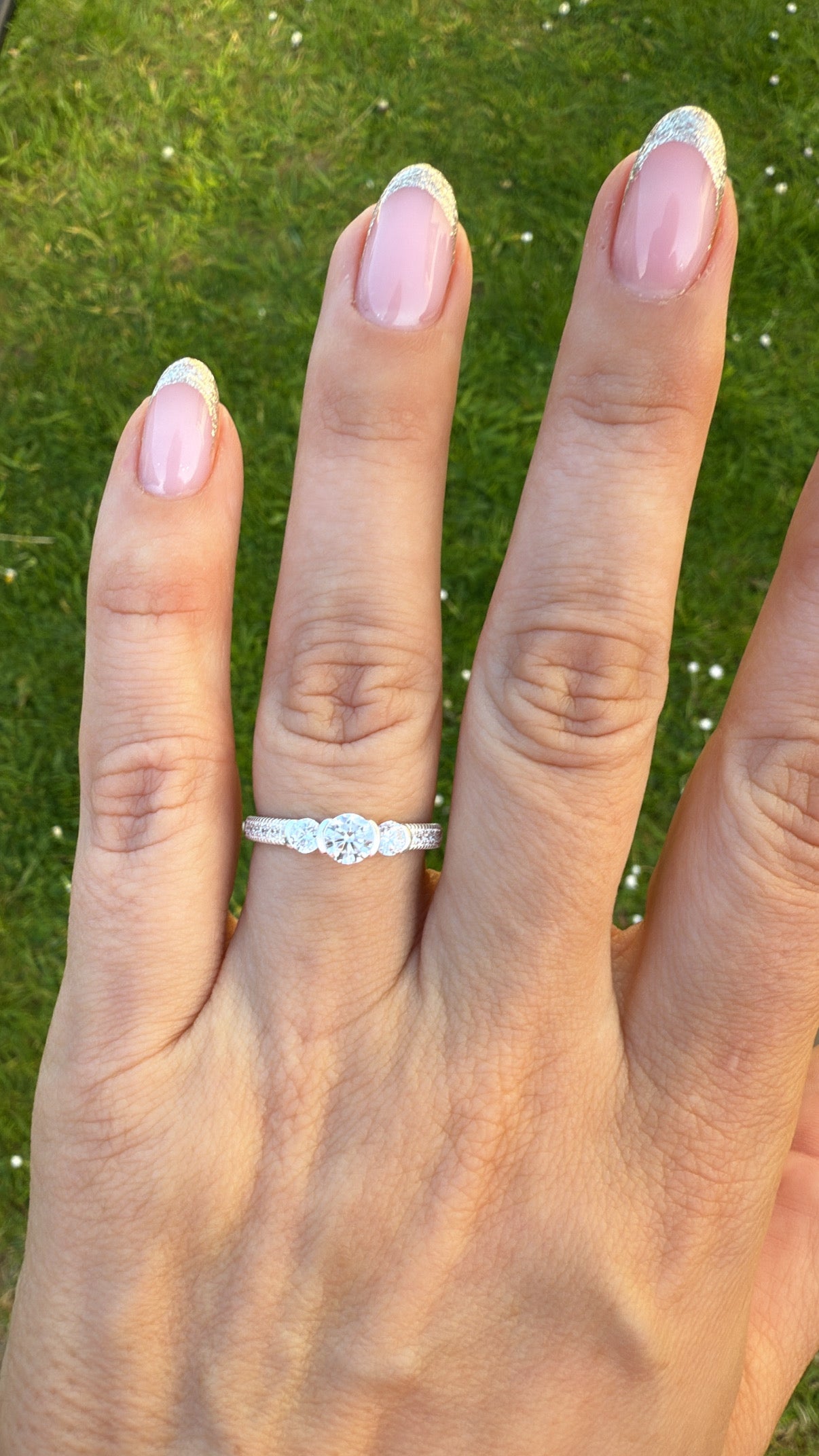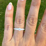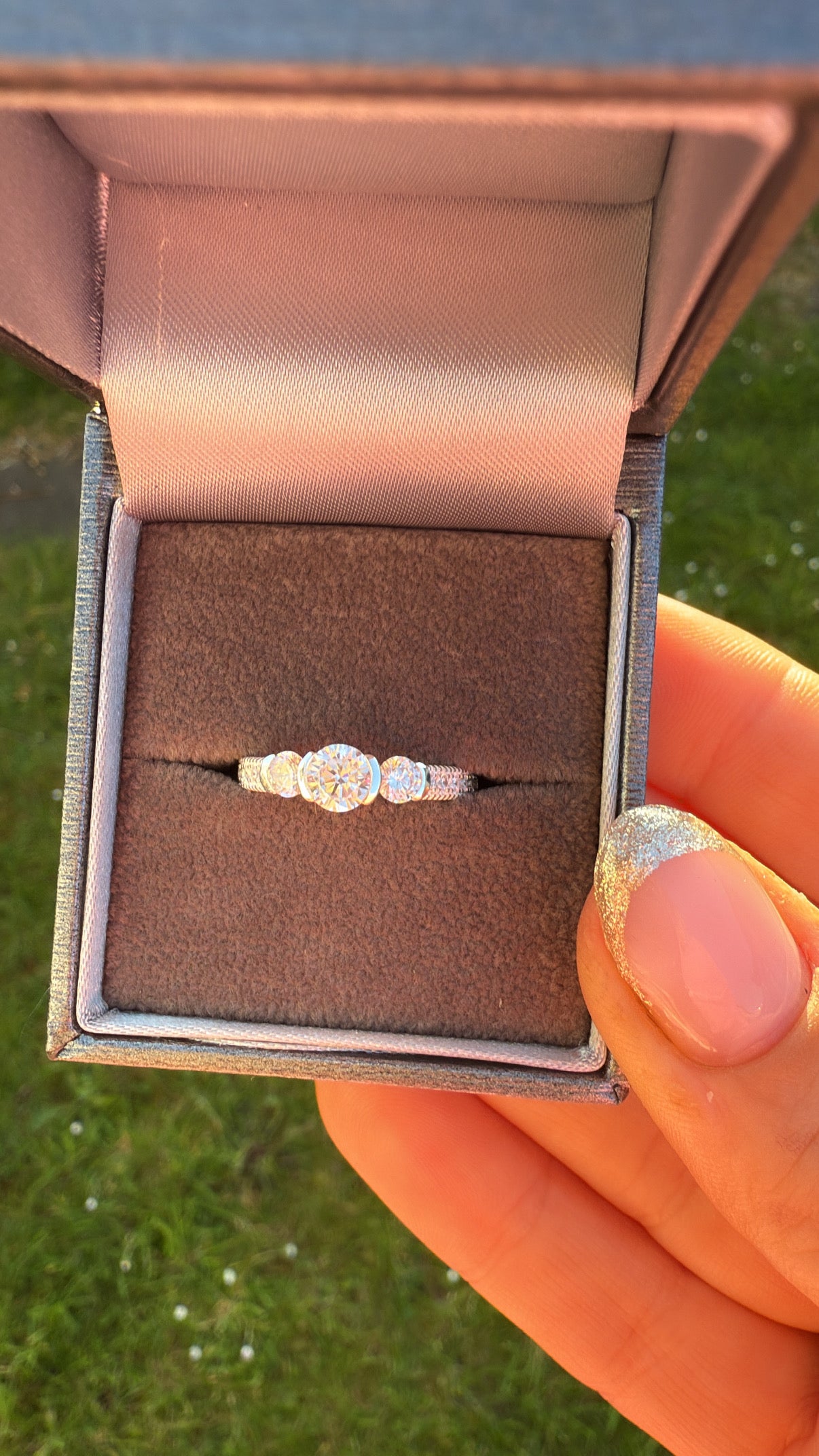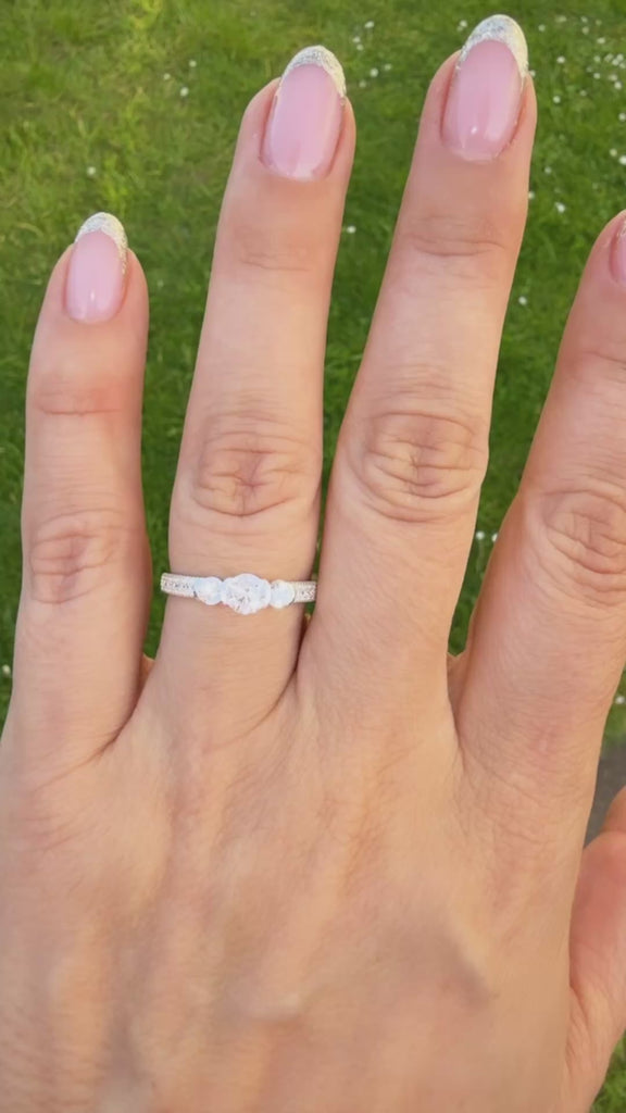 • Crafted from high-quality 925 sterling silver, the sleek band is adorned with delicate pave set stones, adding an extra touch of sparkle. The central stone is gracefully framed by two slightly smaller gems, enhancing its brilliance while maintaining a balanced and refined design.