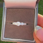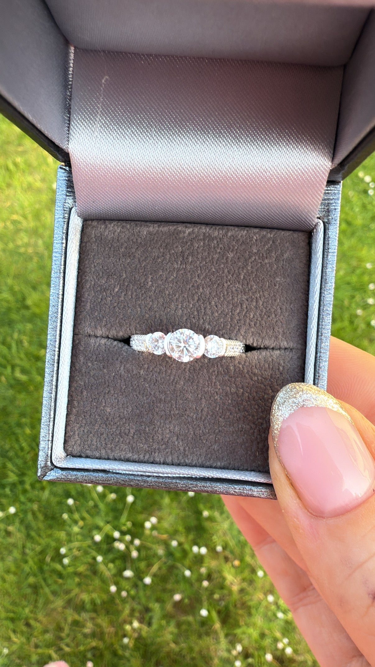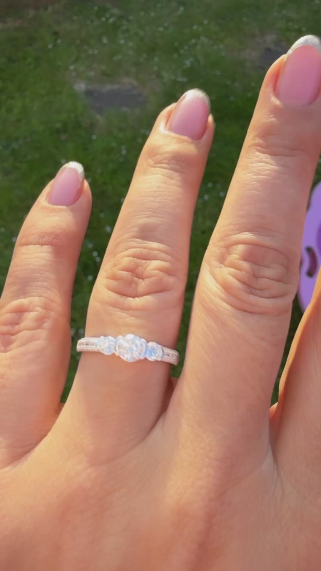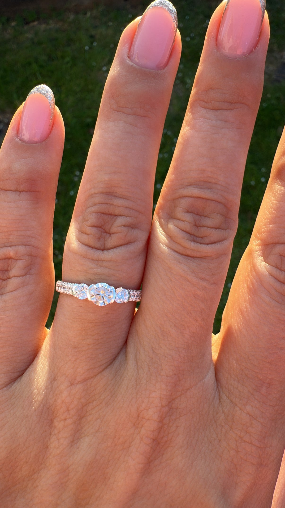 • Timeless elegance meets modern brilliance in this stunning sterling silver three-stone ring. Featuring a dazzling trio of round-cut diamond simulants, this ring symbolizes the past, present, and future making it the perfect choice for engagements, anniversaries, or a sophisticated everyday statement
