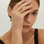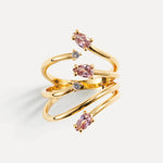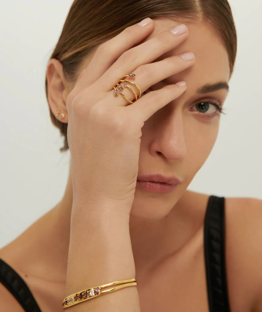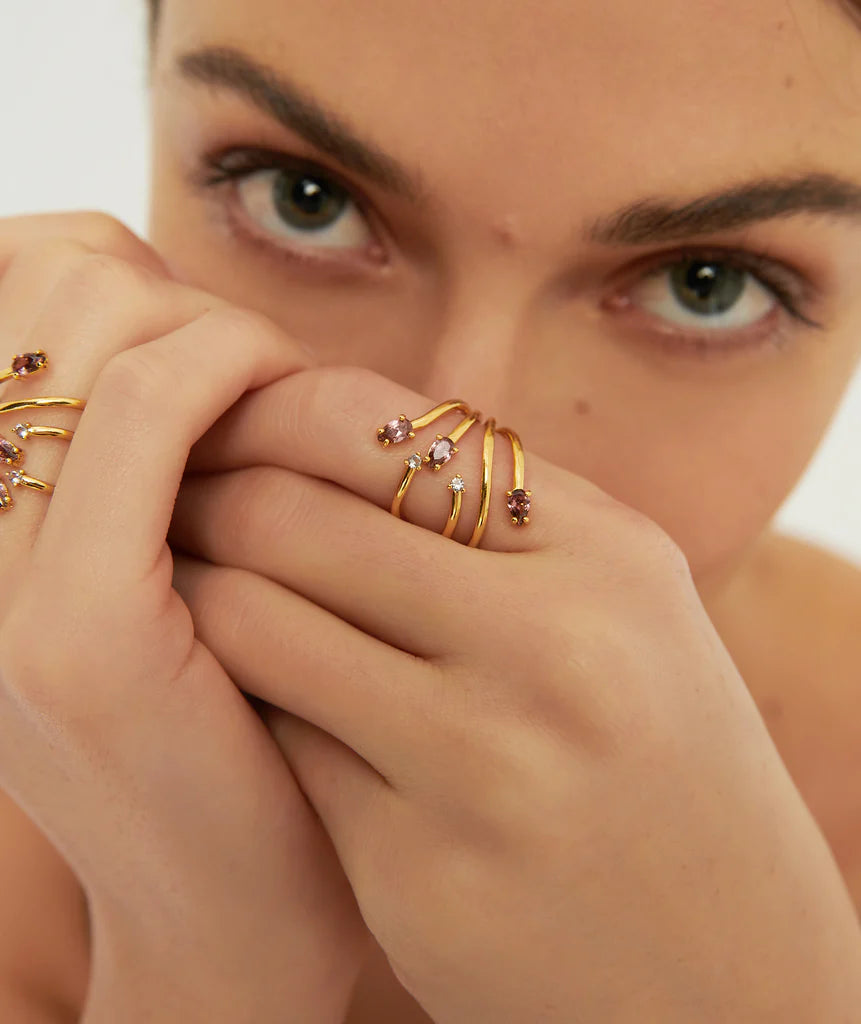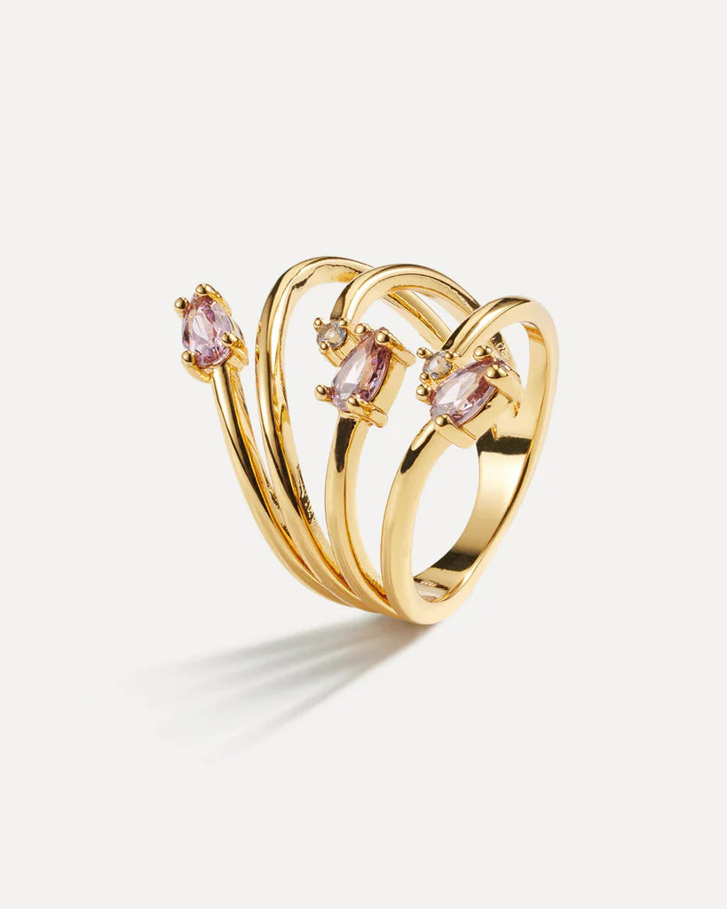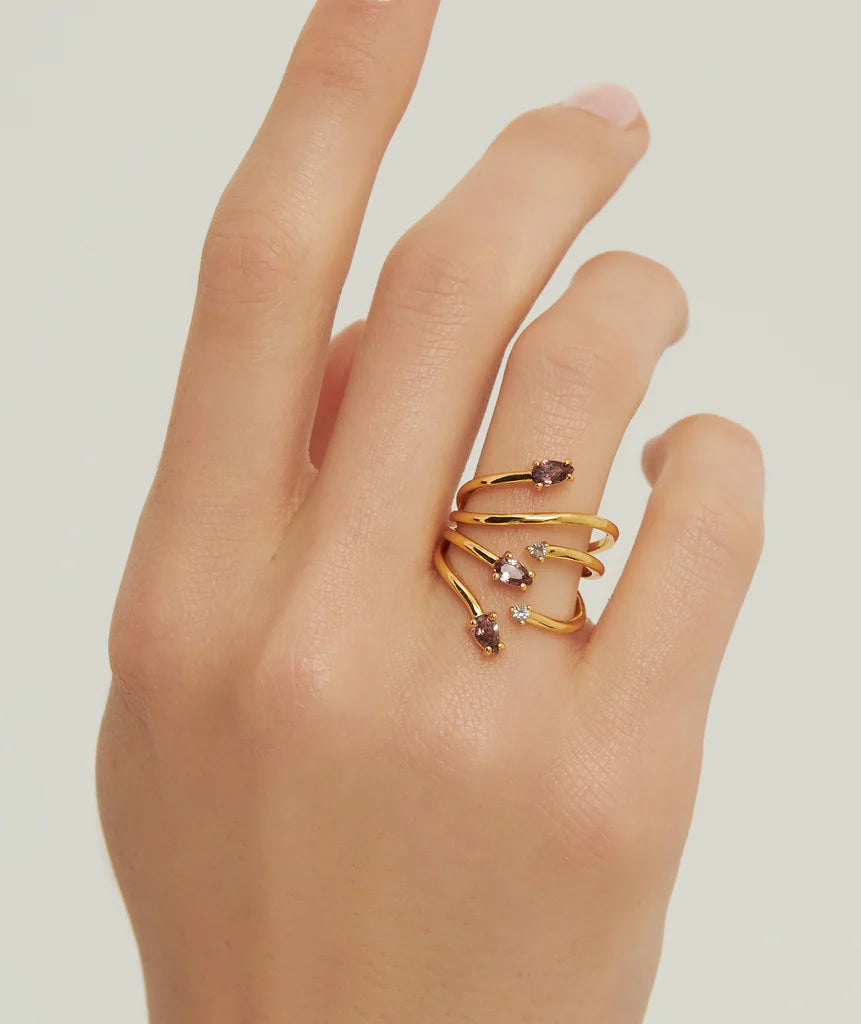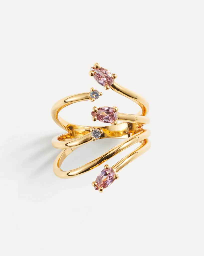 • Irregular shapes, unpredictable curves and delicate zirconia stones that blend harmoniously. Let the colors pull you into the frenzy that is the Delirious Gold Ring.