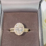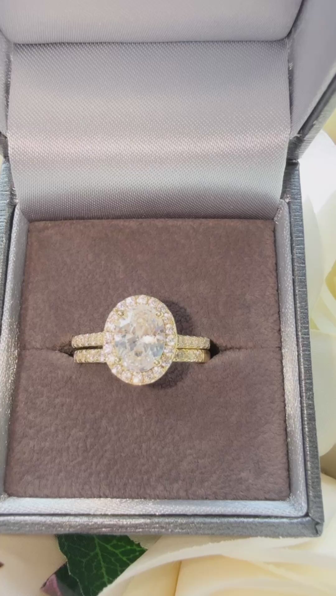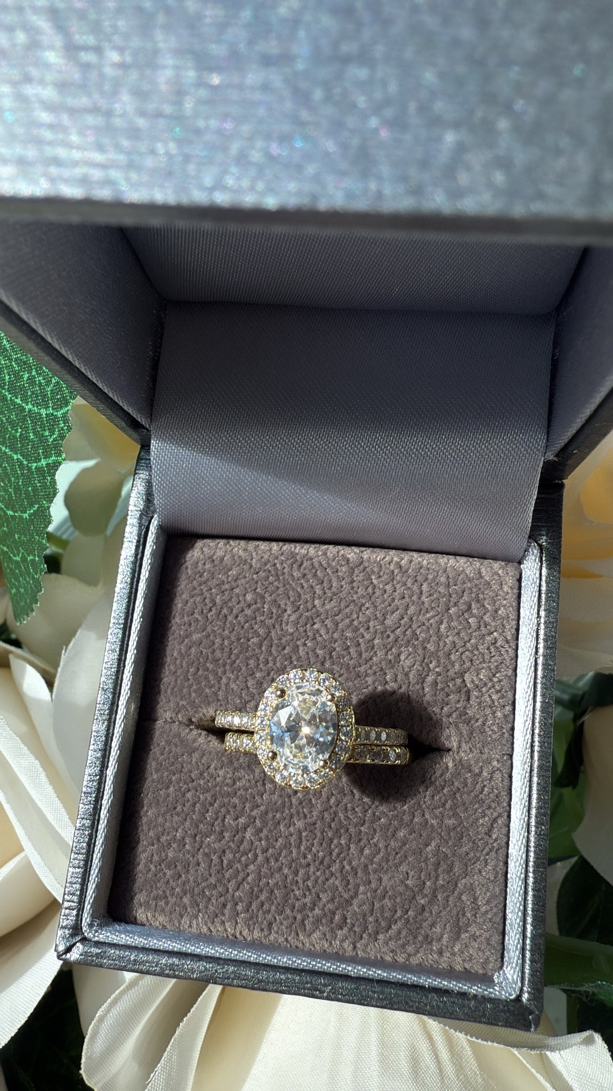 Make a statement with this breathtaking oval-cut halo ring set, beautifully crafted in gold-plated 925 sterling silver. The center stage belongs to a brilliant oval cubic zirconia, expertly framed by a halo of sparkling pavé-set stones, creating an elegant, timeless silhouette. The matching band features a full row of CZ stones, designed to enhance the overall sparkle and create a seamless, luxurious stack.