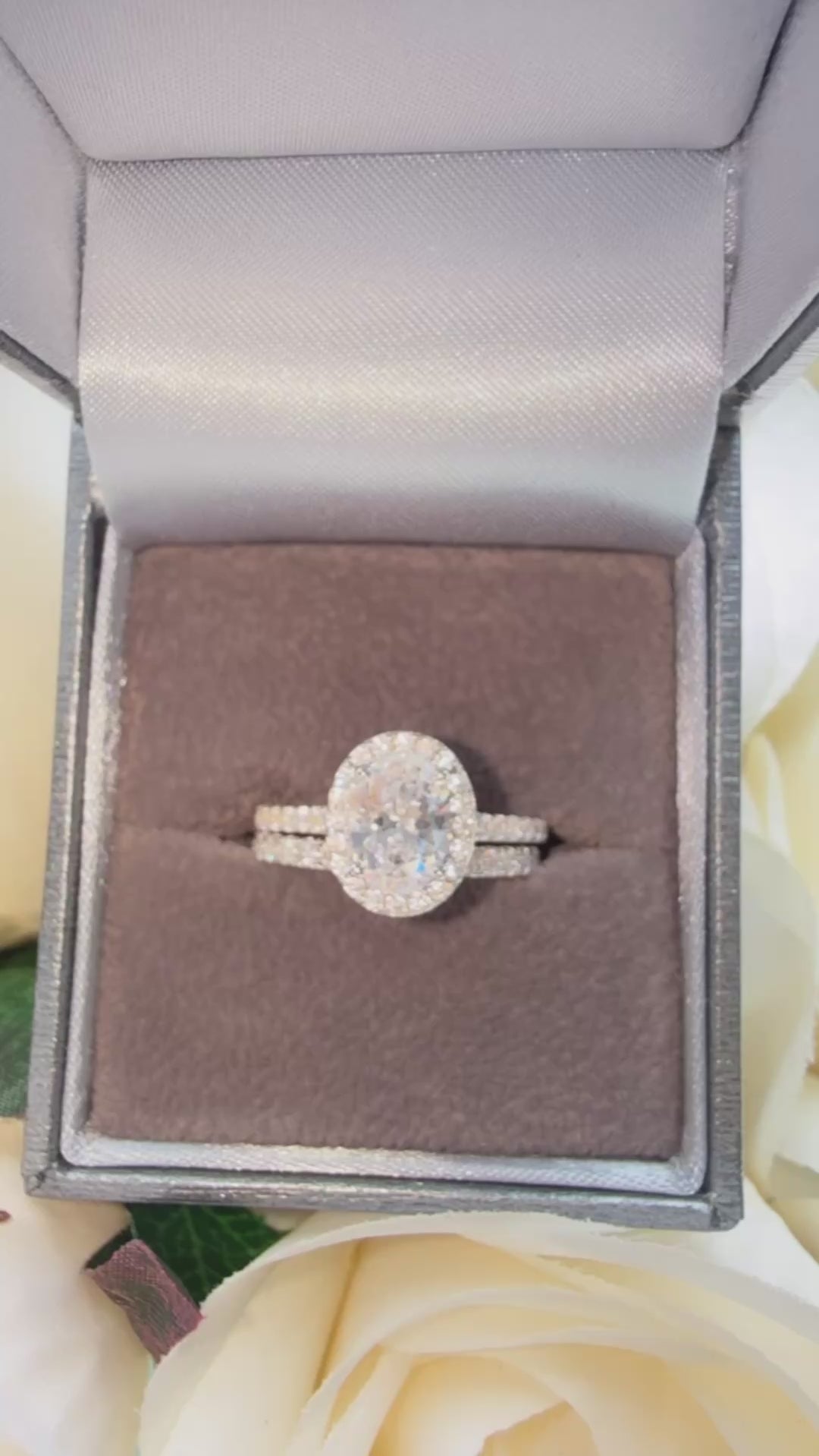 • Stunning oval-cut cubic zirconia centerpiece with halo setting
