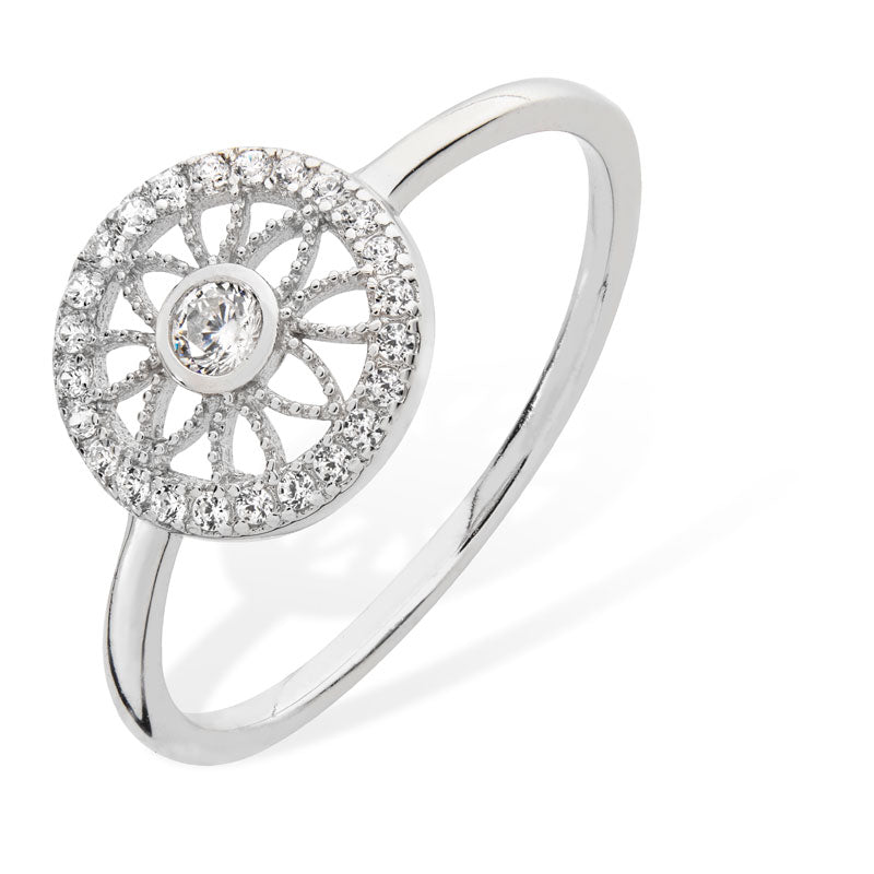 •  Sterling Silver ring with circle  ring and accompanying band with white zirconias and web design.