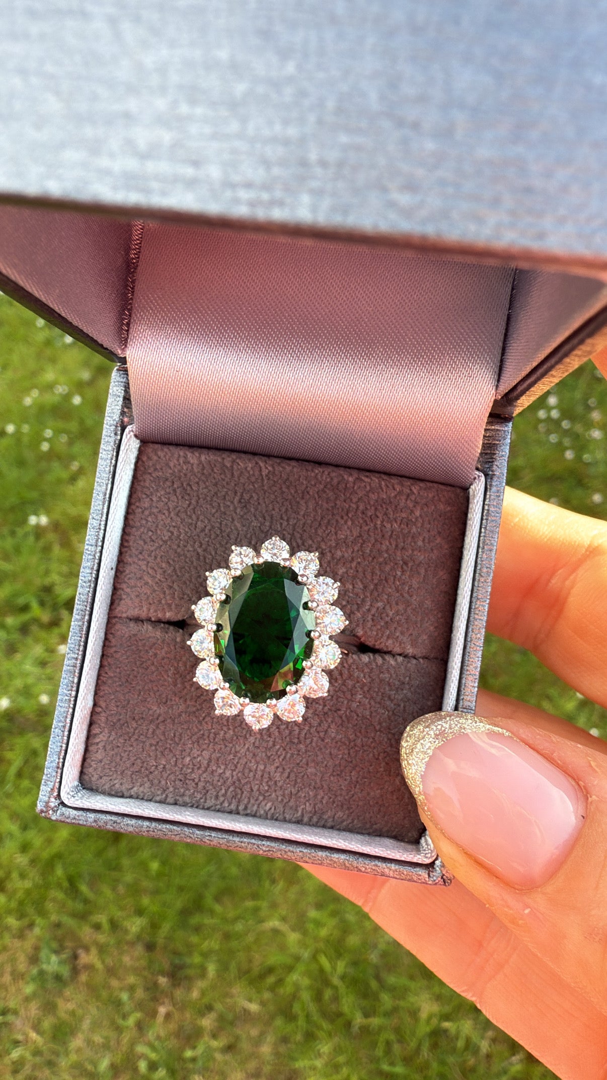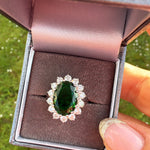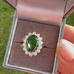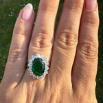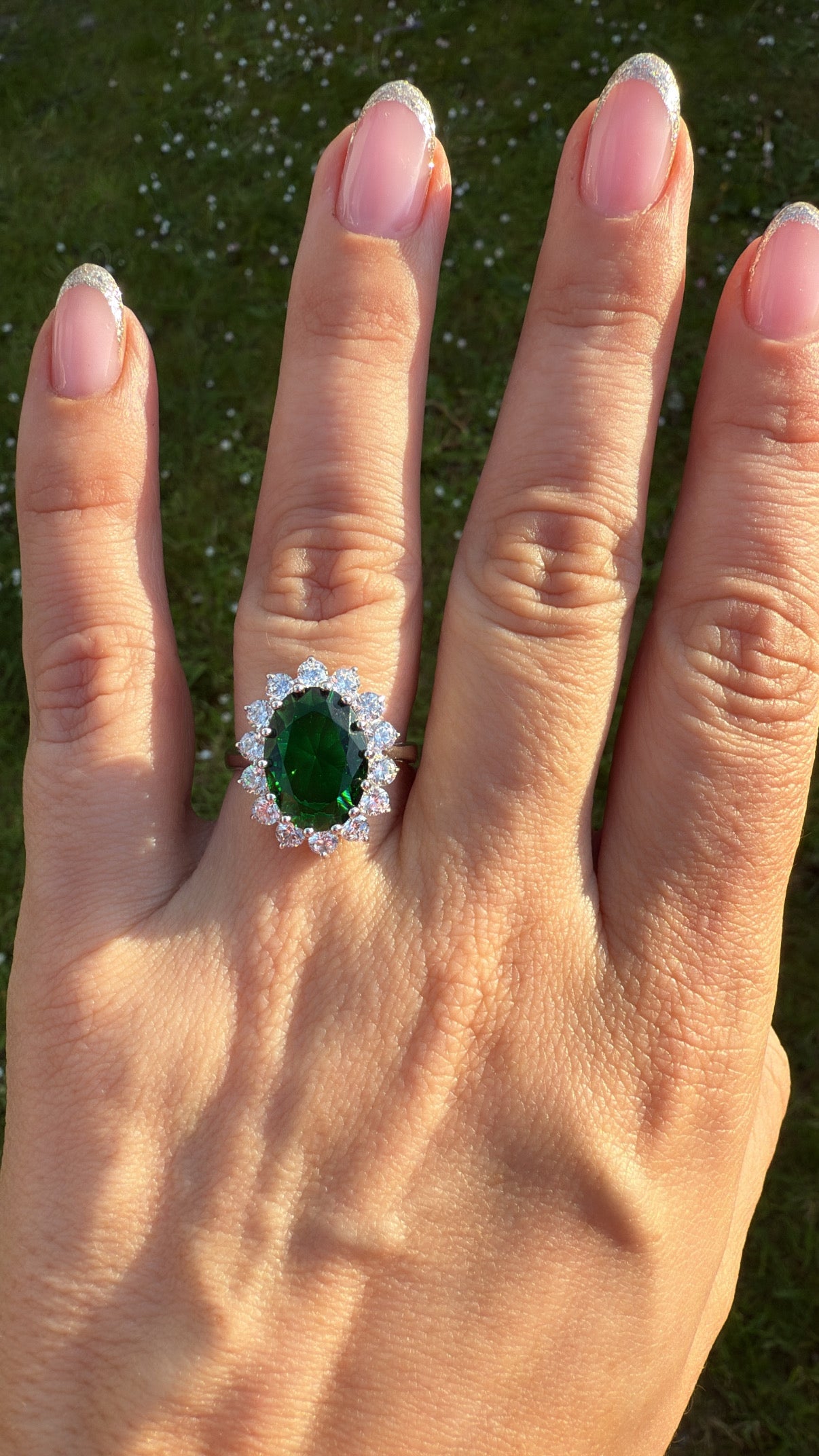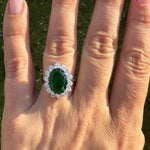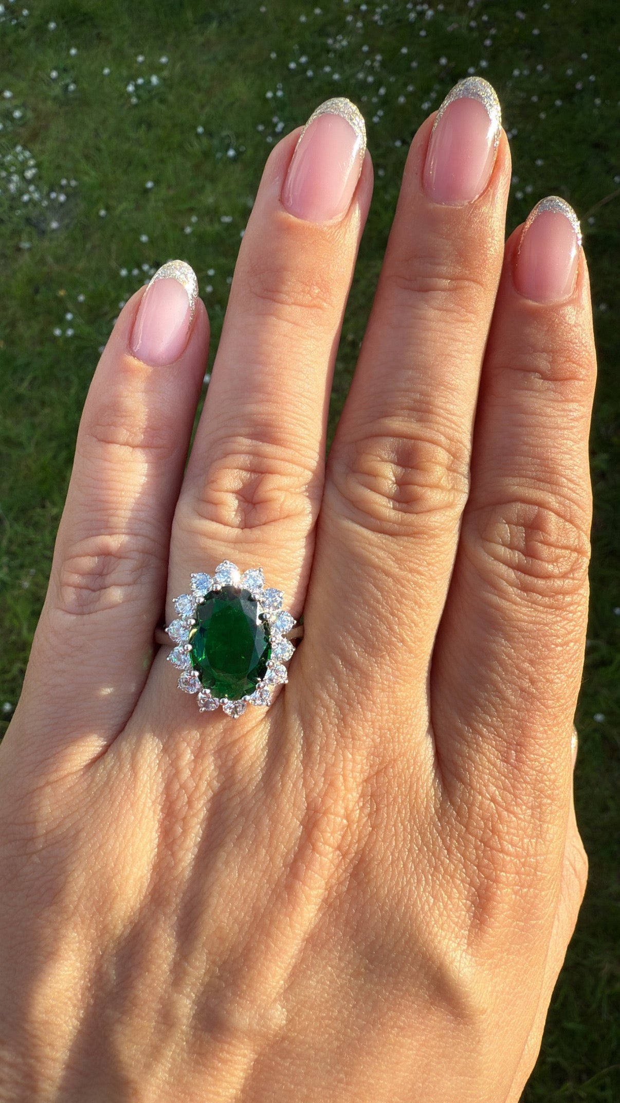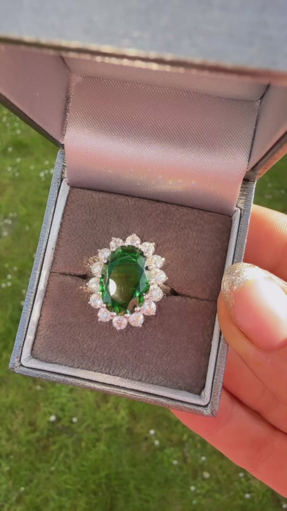 •  Sterling Silver emerald  ring with white zirconias decorating the outside setting.