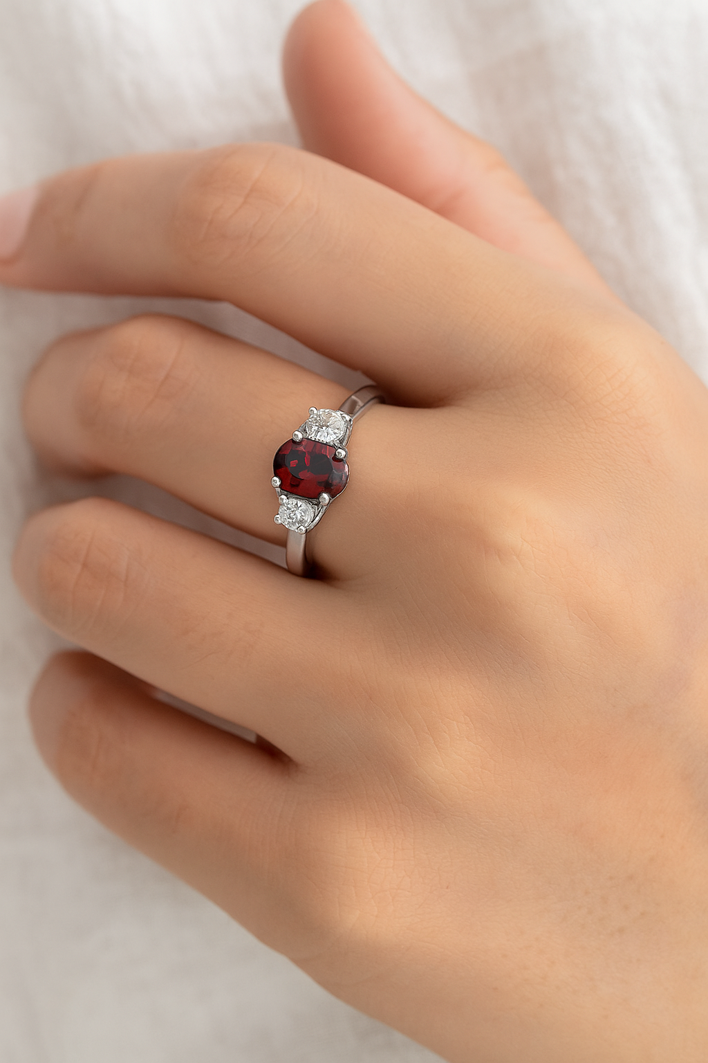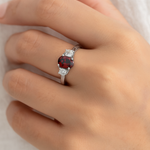 This ring features an elegant design with a central oval-shaped garnet, set in a prong setting with  two smaller clear high-quality cubic zirconia stones.