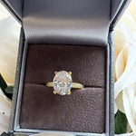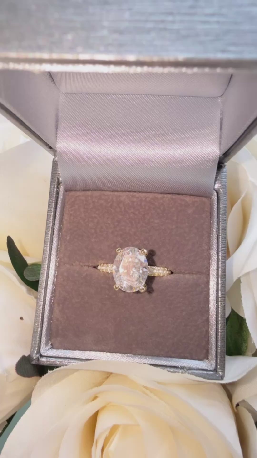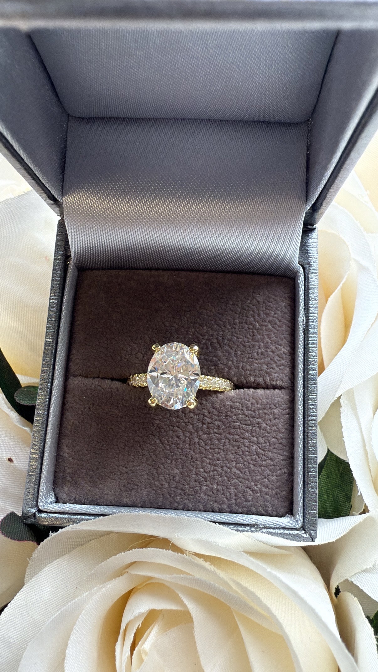Timeless elegance meets modern brilliance in this exquisite sterling silver ring with gold plating.  Featuring a dazzling 3-carat oval-cut cubic zirconia at its center, this piece radiates glamour and sophistication from every angle. The high-polish 925 sterling silver band with gold plating is gracefully accented with pavé-set CZ stones, adding extra sparkle and refinement to its classic silhouette.