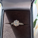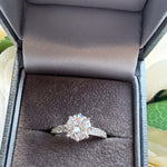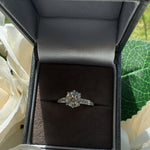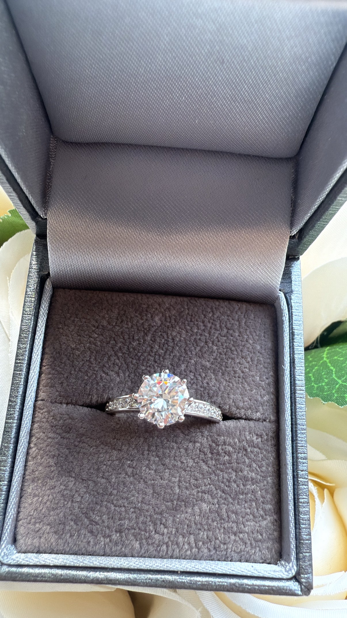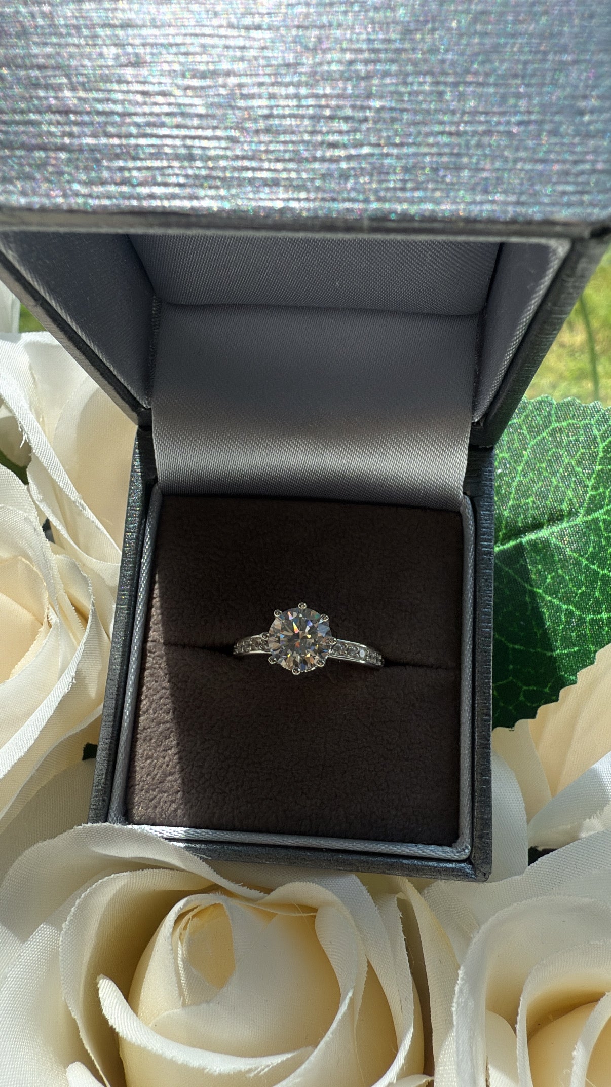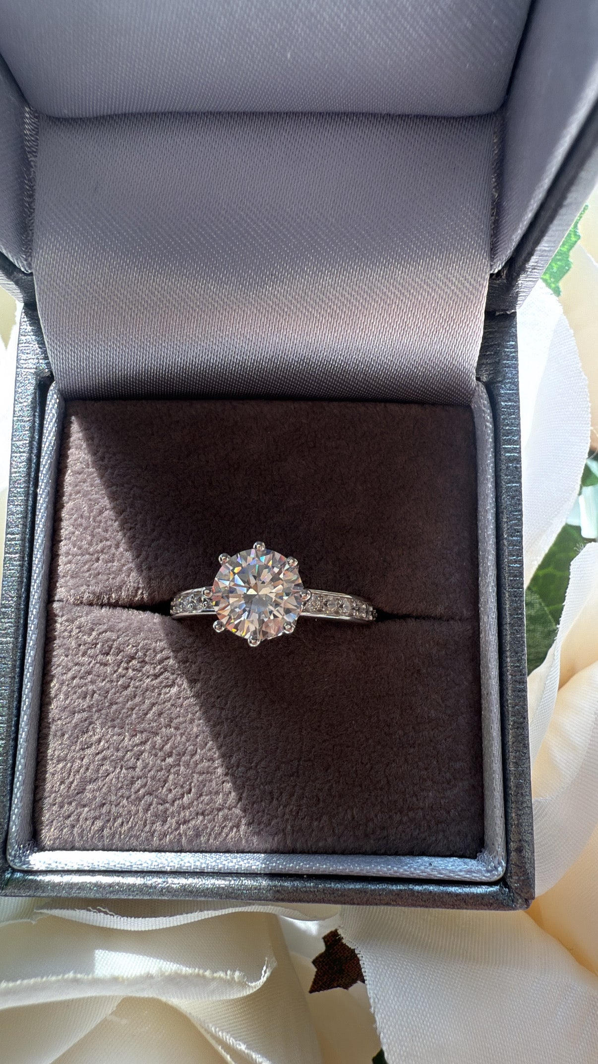 The delicate band, adorned with a row of pavé-set cubic zirconia stones, adds an extra touch of brilliance while maintaining a refined, elegant look. Whether worn as an engagement ring, promise ring, or statement piece, its timeless design ensures it will be cherished for years to come.
